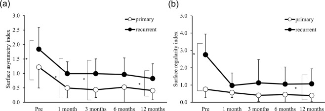 This retrospective observational study compared long-term topographic changes after recurrent- and primary-pterygium surgery depending on pterygium size. Patients who underwent recurrent-pterygium excision between 2002-2013 and age, sex, and pterygium size-matched controls who underwent primary-pterygium surgery were included (33 eyes of 33 patients in each group). Pterygium size was graded per advancing edge position: <1/3 of corneal diameter (grade 1), outside the pupil (grade 2), and within the pupillary area (grade 3). Surface asymmetry index (SAI), surface regularity index (SRI) in corneal topography, and uncorrected and best-spectacle-corrected visual acuity were compared before and 1, 3, 6, and 12 months postoperatively. Three, 17, and 13 eyes had grades 1, 2, and 3, respectively. In grade 2, the SAI and SRI were respectively significantly larger at all observation points (p = 0.01, 0.03, 0.02, 0.02, and 0.004) and before and 6 and 12 months postoperatively (p = 0.02, 0.04, and 0.03) in recurrent pterygium. In grade 3, the SAI was significantly larger before and 1, 3, and 12 months postoperatively (p = 0.04, 0.01, 0.01, and 0.02) and the SRI was significantly larger before and 12 months postoperatively (p < 0.001, 0.02) in recurrent pterygium. Corneal irregularity persisted 12 months after recurrent-pterygium surgery compared with that in same-size primary pterygium.