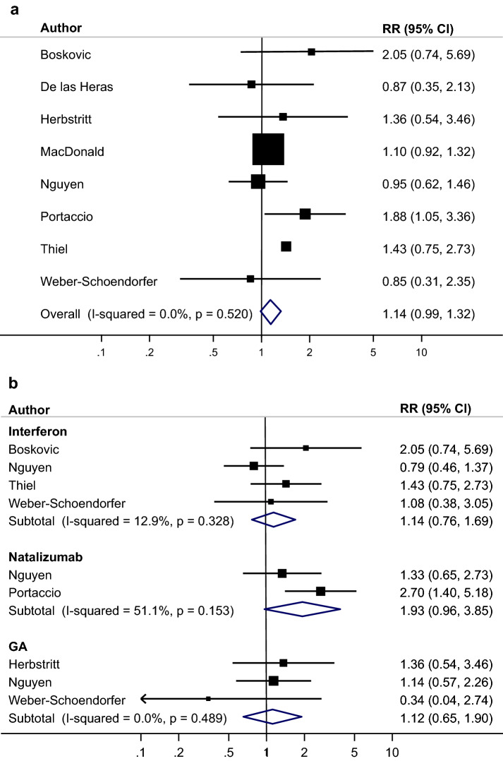 Neurologists managing women with Multiple Sclerosis (MS) need information about the safety of disease modifying drugs (DMDs) during pregnancy. However, this knowledge is limited. The present study aims to summarize previous studies by performing a systematic review and meta-analyses. The terms "multiple sclerosis" combined with DMDs of interest and a broad profile for pregnancy terms were used to search Embase and Medline databases to identify relevant studies published from January 2000 to July 2019.1260 studies were identified and ten studies met our inclusion criteria. Pooled risk ratios (RR) of pregnancy and birth outcomes in pregnancies exposed to DMDs compared to those not exposed were calculated using a random effects model. For spontaneous abortion RR = 1.14, 95% CI 0.99-1.32, for preterm births RR = 0.93, 95% CI 0.72-1.21 and for major congenital malformations RR = 0.86, 95% CI 0.47-1.56. The most common major congenital malformations reported in MS patients exposed to MS drugs were atrial septal defect (ASD) (N = 4), polydactyly (N = 4) and club foot (N = 3), which are among the most prevalent birth defects observed in the general population. In conclusion, interferons, glatiramer acetate or natalizumab, do not appear to increase the risk for spontaneous abortions, pre-term birth or major congenital malformations. There were very few patients included that were exposed to fingolimod, azathioprine and rituximab; therefore, these results cannot be generalized across drugs. Future studies including internal comparators are needed to enable treating physicians and their patients to decide on the best treatment options.