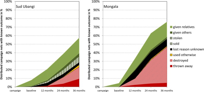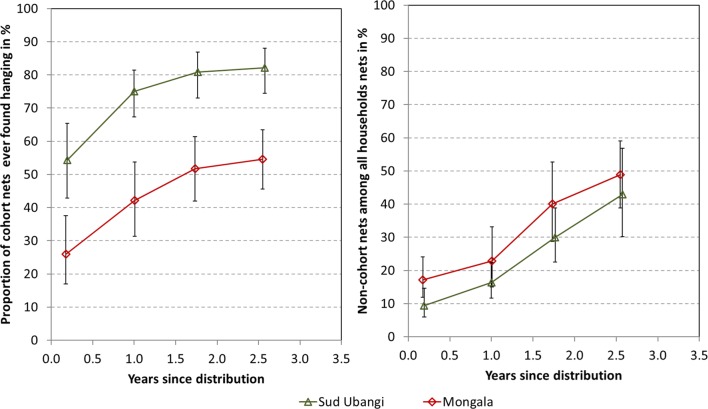 Results: A total of 754 campaign nets (109% of target) from 240 households were included in the study. Definite outcomes could be determined for 67% of the cohort nets in Sud Ubangi and 74% in Mongala. After 31 months all-cause attrition was 57% in Sud Ubangi and 76% in Mongala (p = 0.005) and attrition due to wear and tear was 26% in Sud Ubangi and 48% in Mongala (p = 0.0009). Survival in serviceable condition at the last survey was 37% in Sud Ubangi and 17% in Mongala (p = 0.003). Estimated median survival was 1.6 years for the DawaPlus® 2.0 in Mongala (95% CI 1.3-1.9) and 2.2 years for the DuraNet in Sud Ubangi (95% CI 2.0-2.4). Multivariable Cox proportionate hazard models suggest that the difference between sites was mainly attributable to the LLIN brand. Insecticidal effectiveness was optimal for DuraNet©, but significantly dropped after 24 months for DawaPlus® 2.0.