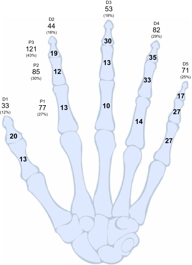 Methods: This study presents a retrospective review of 261 patients with 283 phalangeal fractures ≥ 18 years of age who were treated in our level I trauma centre between 2017 and 2018. The data were obtained by the analysis of the institution's database, and radiological examinations.