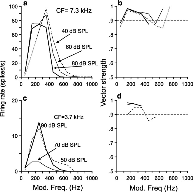 Octopus cells in the ventral cochlear nucleus (VCN) have been difficult to study because of the very features that distinguish them from other VCN neurons. We performed in vivo recordings in cats on well-isolated units, some of which were intracellularly labeled and histologically reconstructed. We found that responses to low-frequency tones with frequencies < 1 kHz reveal higher levels of neural synchrony and entrainment to the stimulus than the auditory nerve. In responses to higher frequency tones, the neural discharges occur mostly near the stimulus onset. These neurons also respond in a unique way to 100 % amplitude-modulated (AM) tones with discharges exhibiting a bandpass tuning. Responses to frequency-modulated sounds (FM) are unusual: Octopus cells react more vigorously during the ascending than the descending parts of the FM stimulus. We examined responses of neurons in the ventral nucleus of the lateral lemniscus (VNLL) whose discharges to tones and AM sounds are similar to octopus cells. Repeated stimulation with short tone pips of VCN and VNLL onset neurons evokes trains of action potentials with gradual shifts toward later times in their first spike latency. This behavior parallels short-term post-synaptic depression observed by other authors in in vitro VCN recordings of octopus cells. VCN and VNLL onset units in cats respond to frozen noise stimuli with gaps as narrow as 1 ms with a robust discharge near the stimulus onset following the gap. This finding suggests that VCN and VNLL onset cells play a role in gap detection, which is of great importance to speech perception.