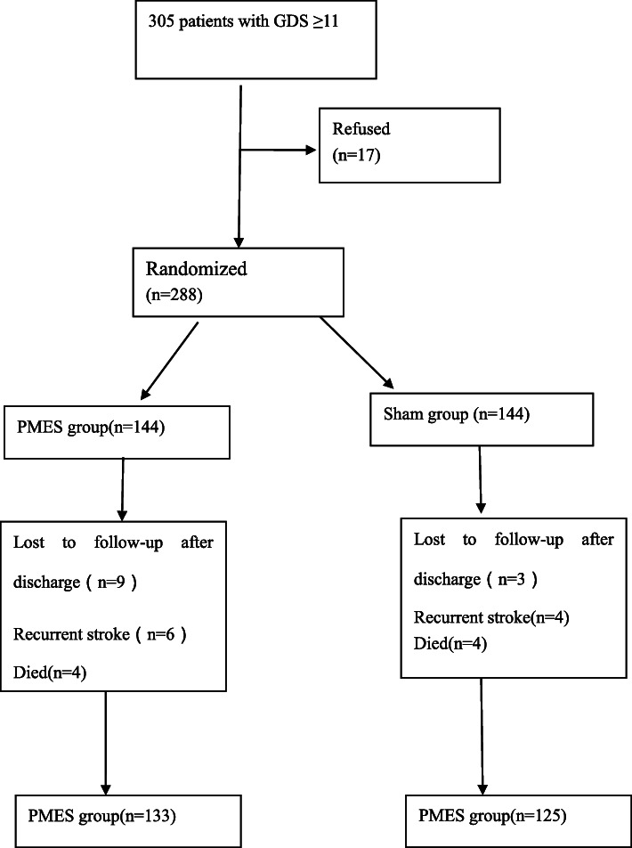 Methods: This study was a prospective, randomized, double-blind, and sham-controlled study. A total of 258 clinically depressed ischaemic stroke patients within 14 days of index stroke were randomly assigned to the PMES plus antidepressant (PMES group, N = 125) and sham plus antidepressant (sham group, N = 133) groups. All patients underwent the Montreal Cognitive Assessment (MoCA) and Hamilton Rating Scale for Depression (HRSD) test at 2 weeks (baseline), and 6 months(M6) after ischaemic stroke. Primary outcomes were the percentage of patients showing a treatment response (≥50% reduction in HRSD score) and depression remission (HRSD score ≤ 9) at 6 months. The secondary outcome was the percentage of patients with a MoCA score < 26.
