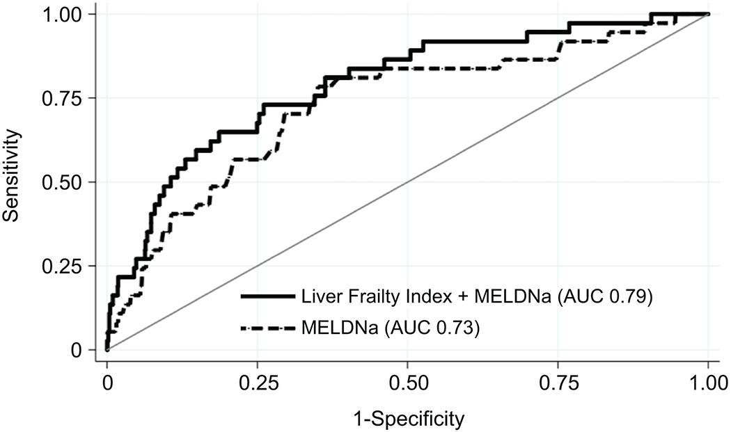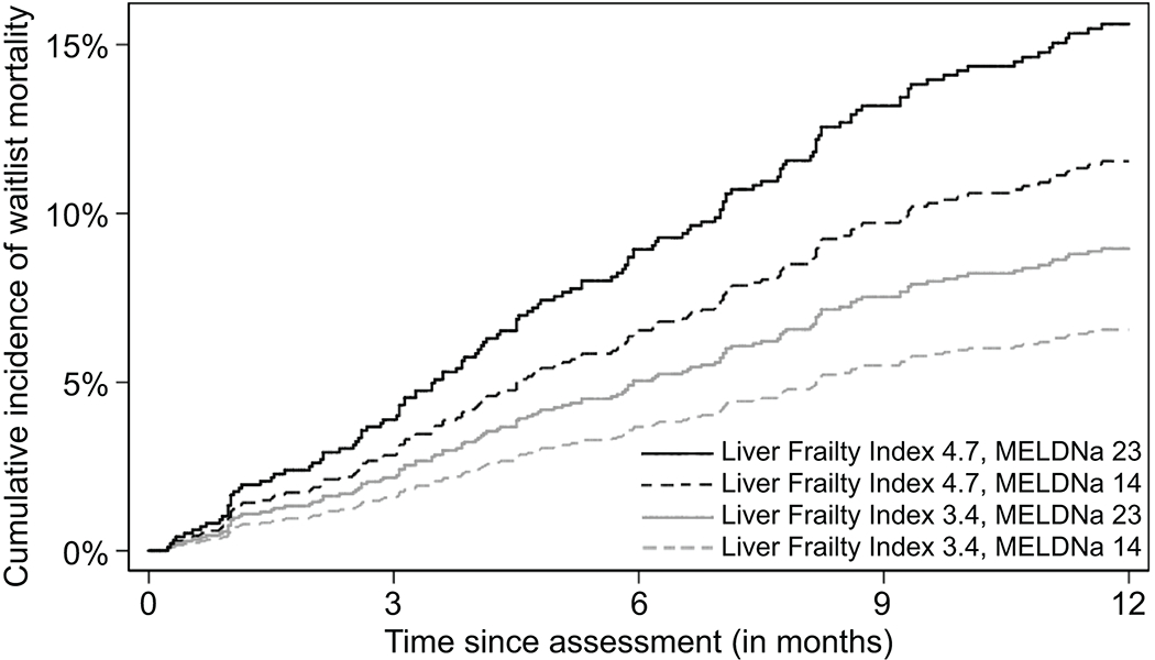 Conclusions: LFI is predictive of waitlist mortality across a wide spectrum of LFI values. The optimal LFI cutoff for waitlist mortality was 4.4 at 3 months and 4.2 at 6 and 12 months. The discriminative performance of LFI+MELDNa was greater than MELDNa alone. Our data suggest that incorporating LFI with MELDNa can more accurately represent waitlist mortality in LT candidates.