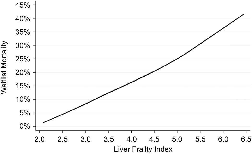 Background and aims: Frailty, as measured by the Liver Frailty Index (LFI), is associated with liver transplant (LT) waitlist mortality. We sought to identify an optimal LFI cutoff that predicts waitlist mortality.