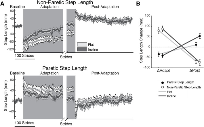 Conclusions: Individuals post-stroke at a chronic stage can adapt more during split-belt walking and have greater after-effects when propulsion demands are augmented by inclining the treadmill surface. Our results are promising since they suggest that increasing propulsion demands during paradigms that force patients to use their paretic side more could correct gait asymmetries post-stroke more effectively.