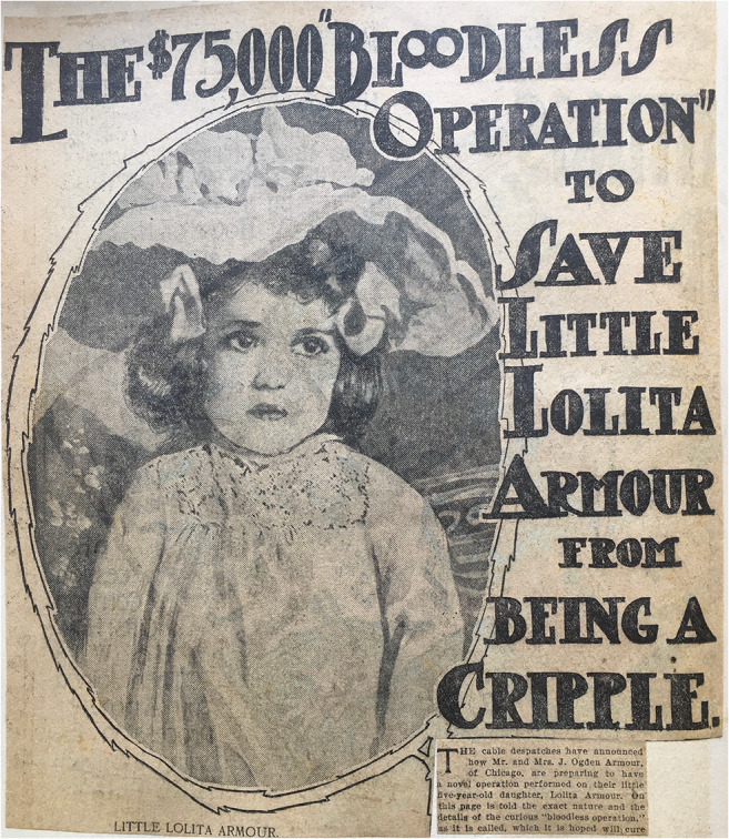 Almost 120 years ago, in 1902, the American multimillionaire J. Ogden Armour invited the Austrian orthopaedic surgeon Adolf Lorenz, professor at the University of Vienna, to treat his daughter Lolita. Lolita was born premature in 1896 and spent the first months of her life in an incubator. Later she was diagnosed with congenital dislocation of both hips. Lorenz had developed a "bloodless" treatment method and was invited by the Armour family to Chicago to "operate" on Lolita. Both hips had already been treated by an American orthopaedic surgeon before but without a satisfactory result. Lorenz should achieve a better one. The operation was performed in Chicago on 12 October 1902 and was accompanied by a very large media spectacle. This article is mainly based on contemporary newspaper reports.