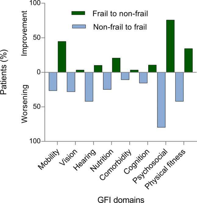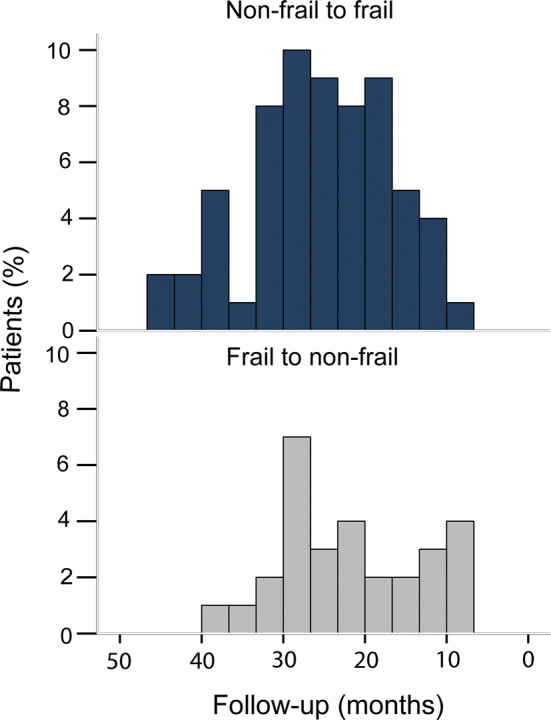 Methods: Between 2014 and 2018, 310 patients, ≥65 years and scheduled for elective vascular surgery, were included in this cohort study. Transition in frailty state between preoperative and follow-up measurement was determined using the Groningen Frailty Indicator (GFI), a validated tool to measure frailty in vascular surgery patients. Frailty is defined as a GFI score ≥4. Patient characteristics leading to a transition in frailty state were analyzed using multivariable Cox regression analysis.