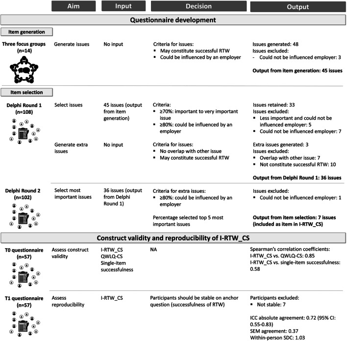 Results: Forty-eight issues were generated, of which seven were included: 'enjoyment in work'; 'work without affecting health'; 'confidence of employer without assumptions about work ability'; 'open communication with employer'; 'feeling welcome at work'; 'good work-life balance'; and 'joint satisfaction with the situation (employer and cancer survivor)'. Correlations with single-item successful RTW and QWLQ-CS were 0.58 and 0.85, respectively. The reproducibility showed an ICC of 0.72.
