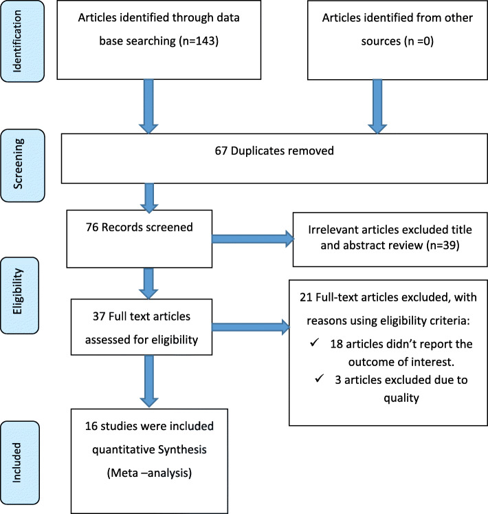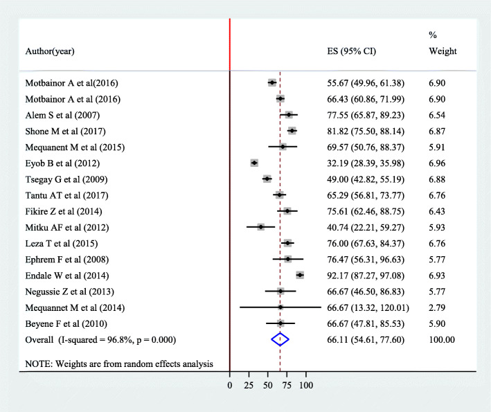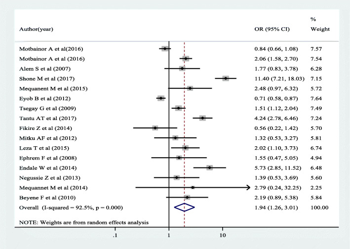 Results: A total of 143 articles were identified, of which 15 studies were included in the final model with a total sample size of 2084 female-headed households. The pooled estimate of food insecurity among female-headed households was 66.11% (95% confidence level (CL) 54.61, 77.60). Female-headed households had 1.94 (95% CL 1.26, 3.01) times the odds of developing food insecurity as compared with male-headed households in Ethiopia. However, considerable heterogeneity across studies was also exhibited (I 2 = 92.5%, p value < 0.001).
