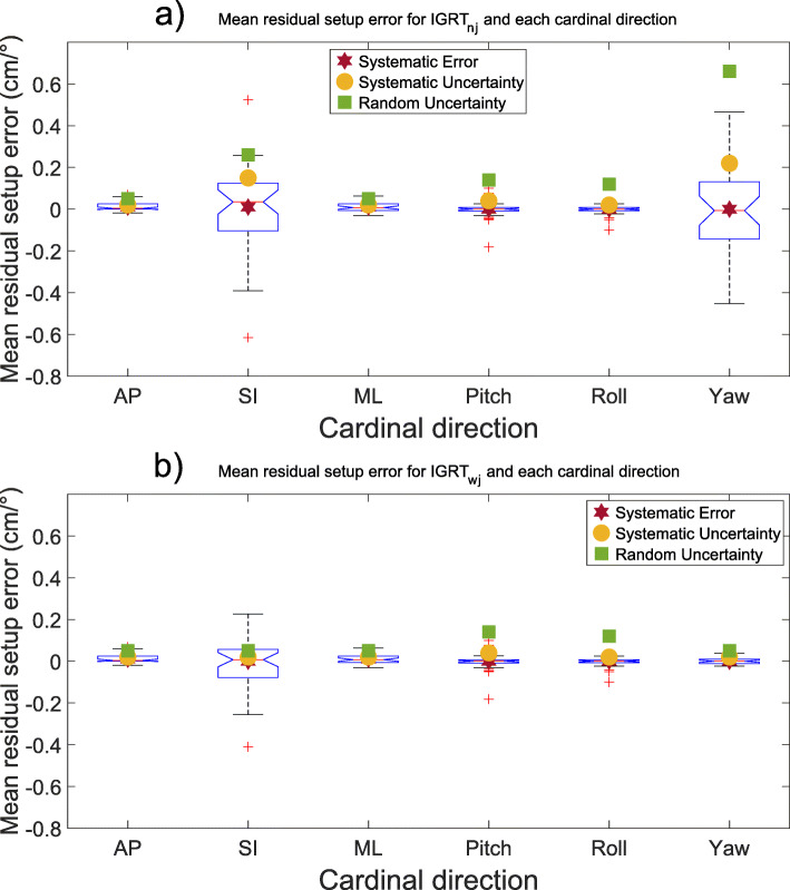 Results: For an action-level (AL)-protocol and a non-action level (NAL)-protocol, the translational residual setup error can be as large as 24 mm for an individual patient during a single fraction, and the rotational error as large as 6.1°. With daily IGRT, the maximum setup errors were reduced to 1 mm translational and 5.4° rotational versus 1 mm translational and 2.4° rotational for 3- and 6- degrees of freedom (DoF) couch shifts, respectively. With a daily 6-DoF IGRT protocol for a wide field junction irradiation technique, the residual positioning uncertainty was below 1 mm and 1° for translational and rotational directions, respectively. The largest rotational uncertainty was found for the patients' roll even though this was the least common type of rotational error, while the largest translational uncertainty was found in the patients' anterior-posterior-axis.