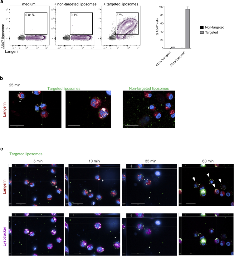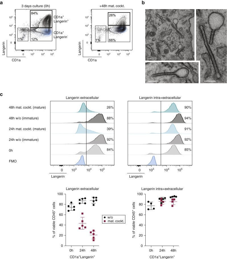 Langerhans cells (LCs) in the skin are a first line of defense against pathogens but also play an essential role in skin homeostasis. Their exclusive expression of the C-type lectin receptor Langerin makes them prominent candidates for immunotherapy. For vaccine testing, an easily accessible cell platform would be desirable as an alternative to the time-consuming purification of LCs from human skin. Here, we present such a model and demonstrate that monocytes in the presence of GM-CSF, TGF-β1, and the Notch ligand DLL4 differentiate within 3 days into CD1a+Langerin+cells containing Birbeck granules. RNA sequencing of these monocyte-derived LCs (moLCs) confirmed gene expression of LC-related molecules, pattern recognition receptors, and enhanced expression of genes involved in the antigen-presenting machinery. On the protein level, moLCs showed low expression of costimulatory molecules but prominent expression of C-type lectin receptors. MoLCs can be matured, secrete IL-12p70 and TNF-α, and stimulate proliferation and cytokine production in allogeneic CD4+ and CD8+ T cells. In regard to vaccine testing, a recently characterized glycomimetic Langerin ligand conjugated to liposomes demonstrated specific and fast internalization into moLCs. Hence, these short-term in vitro‒generated moLCs represent an interesting tool to screen LC-based vaccines in the future.