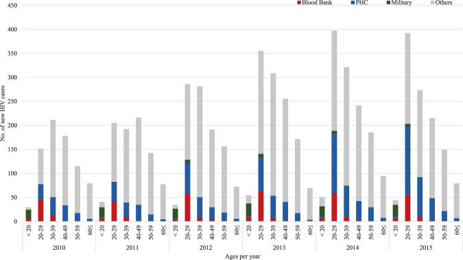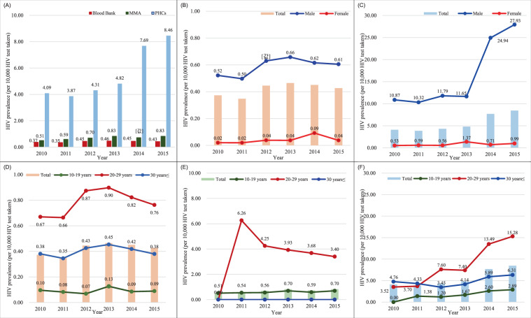 Although the number of newly diagnosed cases of HIV is decreasing worldwide, those in Korea have been steadily on the rise, especially among adolescents (ages 10-19 years) and young adults (ages 20-29 years). To identify the characteristics in the new diagnosis among these age groups, we analyzed HIV testing sizes and HIV prevalence under the national HIV surveillance system in Korea in the last six years. We collected data of HIV tests conducted at Blood Banks (BB), Public Health Centers (PHCs), and Military Manpower Administration (MMA) nationwide every year from 2010 to 2015, except for anonymous tests. HIV prevalence, calculated as the number of new HIV-diagnosed cases per 10,000 test-takers per year, was analyzed according to sex, age, institution, and reason for HIV testing. Data were analyzed using logistic regression. In the three testing institutes, there were new cases of HIV with 50% and 95% of cases diagnosed in young adults and adolescents, respectively. The total size of HIV tests at the three sites was approximately 3.5 million tests per year; 80% of these were conducted in BBs, 10% in PHCs, and 10% in MMA. HIV prevalence, according to age, increased across all age groups for the six years, especially prevalent in young adults doubled during that period (1.01 per 10,000 test-takers in 2010, 2.45 in 2015). HIV prevalence among the "suspected" young male adults who visited PHCs for tests, was highest during the six years, increasing 6.5 times in the last two years (315.79 per 10,000 test-takers in 2014, 335.55 in 2015) compared to before 2014. We identified the characteristics of growing HIV infection in Korea as the increase of HIV prevalence among the suspected of young male adults at PHCs. Further, we propose that HIV prevalence in MMA can be used as an essential index for national HIV surveillance of adolescent boys in Korea.
