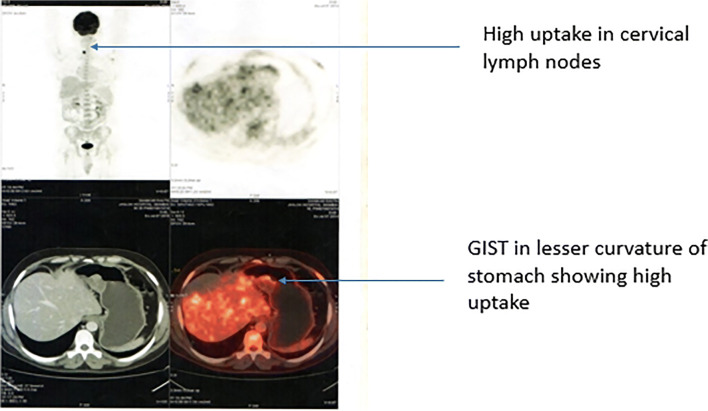 Gastrointestinal stromal tumours (GIST) are the most common gastrointestinal mesenchymal tumours of the gastrointestinal tract. They are diagnosed by the expression of markers like CD 117, CD 34, DOG-1 and PDGFRA. The identification of these mutations has resulted in a better understanding of their oncogenic mechanisms. Few studies have shown the high incidence of a second malignancy including papillary thyroid cancer (PTC) in known patients of GIST. Literature review on pathogenesis of GIST and PTC showed that PTC targeting Protein Kinase C theta (PKCθ) plays role in both PTC and GIST. Further studies have also shown that, apart from somatic and familial gastrointestinal stromal tumours, PDGFRA is associated with many other malignancies including PTC. These studies explain the common genetic pathway involved in the development of GIST and PTC in same patient. In spite of common genetic association between GIST and other malignancies, none of the standard protocols recommends screening for second malignancy. In this article, we present the details of four patients who had associated GIST and PTC at the same time or developed during follow-up.