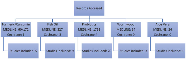 Keywords: Crohn’s disease; aloe vera; complementary and alternative medicine; curcumin; fish oil; inflammatory bowel disease; omega 3- fatty acids; probiotics; ulcerative colitis; wormwood.