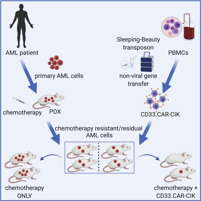 The successful implementation of chimeric antigen receptor (CAR)-T cell therapy in the clinical context of B cell malignancies has paved the way for further development in the more critical setting of acute myeloid leukemia (AML). Among the potentially targetable AML antigens, CD33 is insofar one of the main validated molecules. Here, we describe the feasibility of engineering cytokine-induced killer (CIK) cells with a CD33.CAR by using the latest optimized version of the non-viral Sleeping Beauty (SB) transposon system "SB100X-pT4." This offers the advantage of improving CAR expression on CIK cells, while reducing the amount of DNA transposase as compared to the previously employed "SB11-pT" version. SB-modified CD33.CAR-CIK cells exhibited significant antileukemic activity in vitro and in vivo in patient-derived AML xenograft models, reducing AML development when administered as an "early treatment" and delaying AML progression in mice with established disease. Notably, by exploiting an already optimized xenograft chemotherapy model that mimics human induction therapy in mice, we demonstrated for the first time that CD33.CAR-CIK cells are also effective toward chemotherapy resistant/residual AML cells, further supporting its future clinical development and implementation within the current standard regimens.