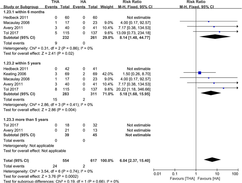 Results: Nine studies met the inclusion criteria totaling 631 participants (301 THA and 330 HA). Four of the studies conducted were identical to a previous study but look at different follow-up periods. Our study revealed that THA was superior in terms of pain HHS, total HHS, EQ-5D, and acetabulum erosion, with a trend of a lower mortality rate within 6 months after surgery. However, the THA group had a longer average operative time and higher dislocation rate, with a trend towards a higher general complication rate. Moreover, there was no significant difference in terms of reoperation rate, postoperative infection, peri-prosthetic fracture, and VTE prevalence across the groups.
