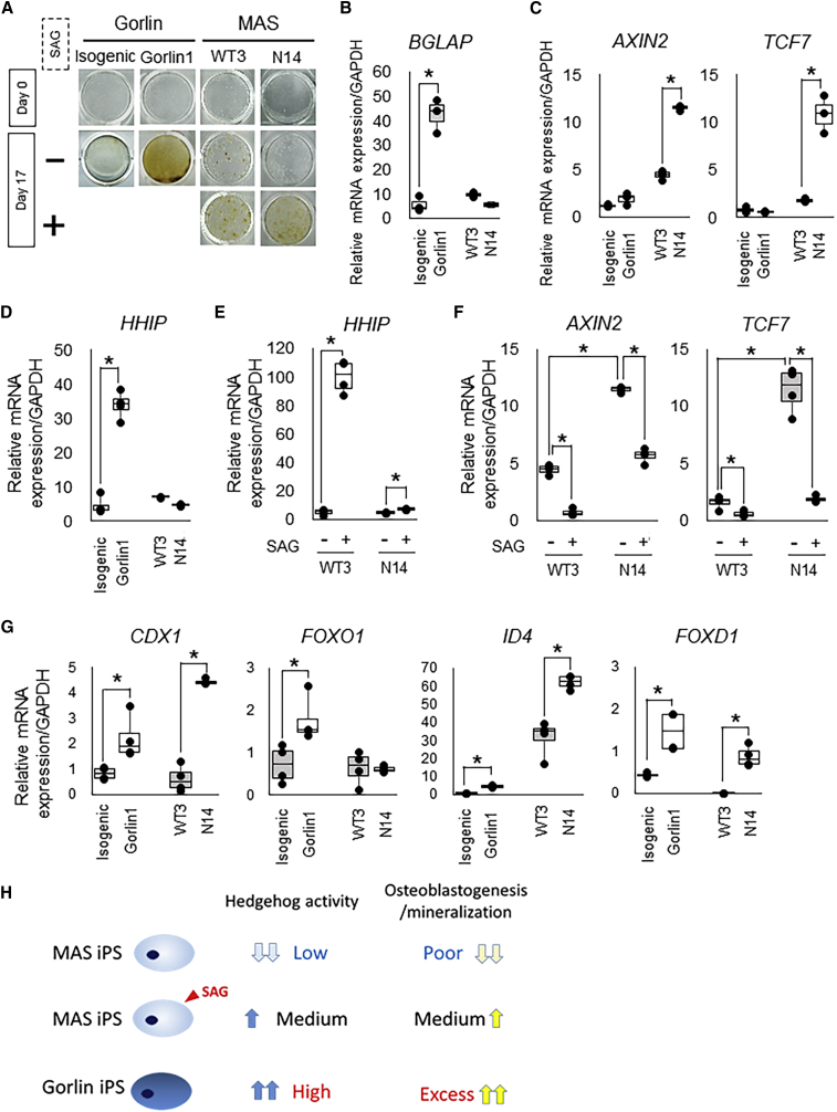 Two genetic diseases, Gorlin syndrome and McCune-Albright syndrome (MAS), show completely opposite symptoms in terms of bone mineral density and hedgehog (Hh) activity. In this study, we utilized human induced pluripotent stem cell (iPSC)-based models of the two diseases to understand the roles of Hh signaling in osteogenesis. Gorlin syndrome-derived iPSCs showed increased osteoblastogenesis and mineralization with Hh signaling activation and upregulation of a set of transcription factors in an osteogenic culture, compared with the isogenic control. MAS-specific iPSCs showed poor mineralization with low Hh signaling activity in the osteogenic culture; impaired osteoblastogenesis was restored to the normal level by treatment with an Hh signaling-activating small molecule. These data suggest that Hh signaling is a key controller for differentiation of osteoblasts from precursors. This study may pave a path to new drug therapies for genetic abnormalities in calcification caused by dysregulation of Hh signaling.