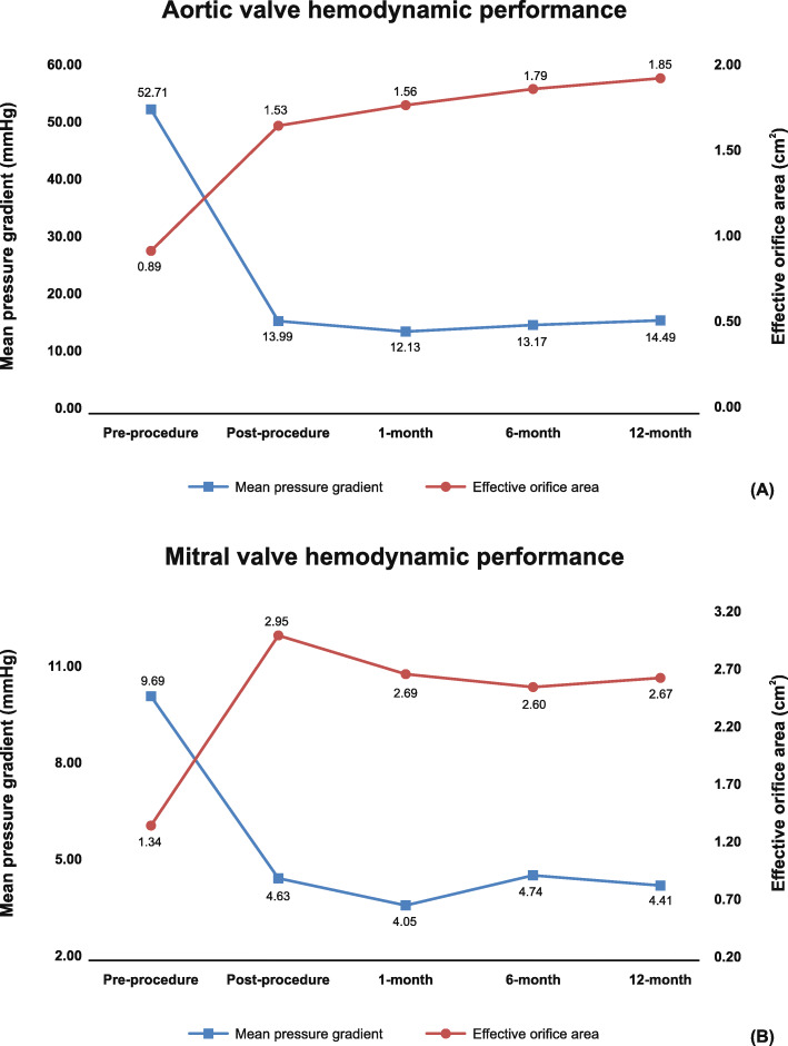 Results: From July 2017 to July 2018, 60 patients underwent implantation of the Dafodil pericardial bioprosthesis. Post-operatively, NYHA functional class significantly improved in all the patients (Aortic: 90% NYHA class-I and 10% NYHA class-II; Mitral: 96.55% NYHA class-I and 3.45% NYHA class-II; P < 0.001). There was no death in aortic valve replacement patients till 12-month. In mitral valve replacement patients, early mortalities occurred in three patients, and late mortality occurred in one patient; none of these were valve-related. Freedom from all-cause mortality reported was 93.33% at 12-month. Mean aortic pressure gradient decreased from 52.71 ± 24.47 mmHg [with 0.89 ± 0.70 cm2 effective orifice area (EOA)] pre-operatively to 14.49 ± 6.58 mmHg (EOA: 1.85 ± 0.27 cm2) at 12-month. Overall, the mitral mean pressure gradient and EOA were 4.41 ± 1.69 mmHg and 2.67 ± 0.48 cm2, respectively, at 12-month. Significant improvement (P < 0.05) in the patients' quality of life was reported at all follow-ups.
