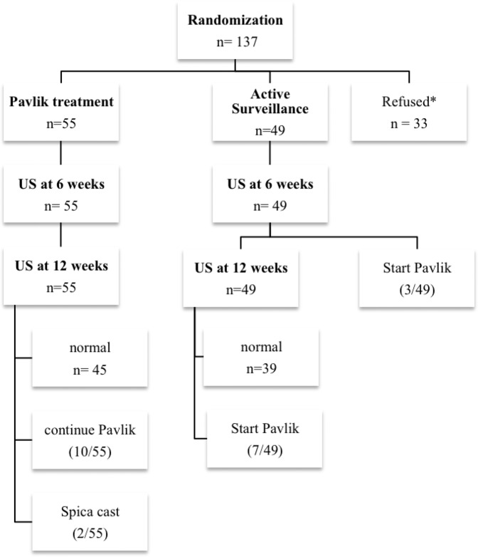 Background The effect of bracing over natural history of stable dysplastic hips is not well known. This multicenter randomized trial aimed at objectifying the effect of abduction treatment versus active surveillance in infants of 3 to 4 months of age. Methods Patients were randomized to either Pavlik harness or active surveillance group. Ultrasound was repeated at 6 and 12 weeks post randomization. The primary outcome was the degree of dysplasia using the Graf α-angle at 6 months of age. The measurement of the acetabular index (AI) on plain pelvis X-rays was used to identify persistent dysplasia after 9 months and walking age (after 18 months). Findings The Pavlik harness group (n = 55) and active surveillance group (n = 49) were comparable for predictors of outcome. At 12 weeks follow-up the mean α-angle was 60.5° ± 3.8° in the Pavlik harness group and 60.0° ± 5.6° in the active surveillance group. (p = 0.30). Analysis of secondary outcomes (standard of care) showed no treatment differences for acetabular index at age 10 months (p = 0.82) and walking age (p = 0.35). Interpretation Pavlik harness treatment of stable but sonographic dysplastic hips has no effect on acetabular development. Eighty percent of the patients will have a normal development of the hip after twelve weeks. Therefore, we recommend observation rather than treatment for stable dysplastic hips.