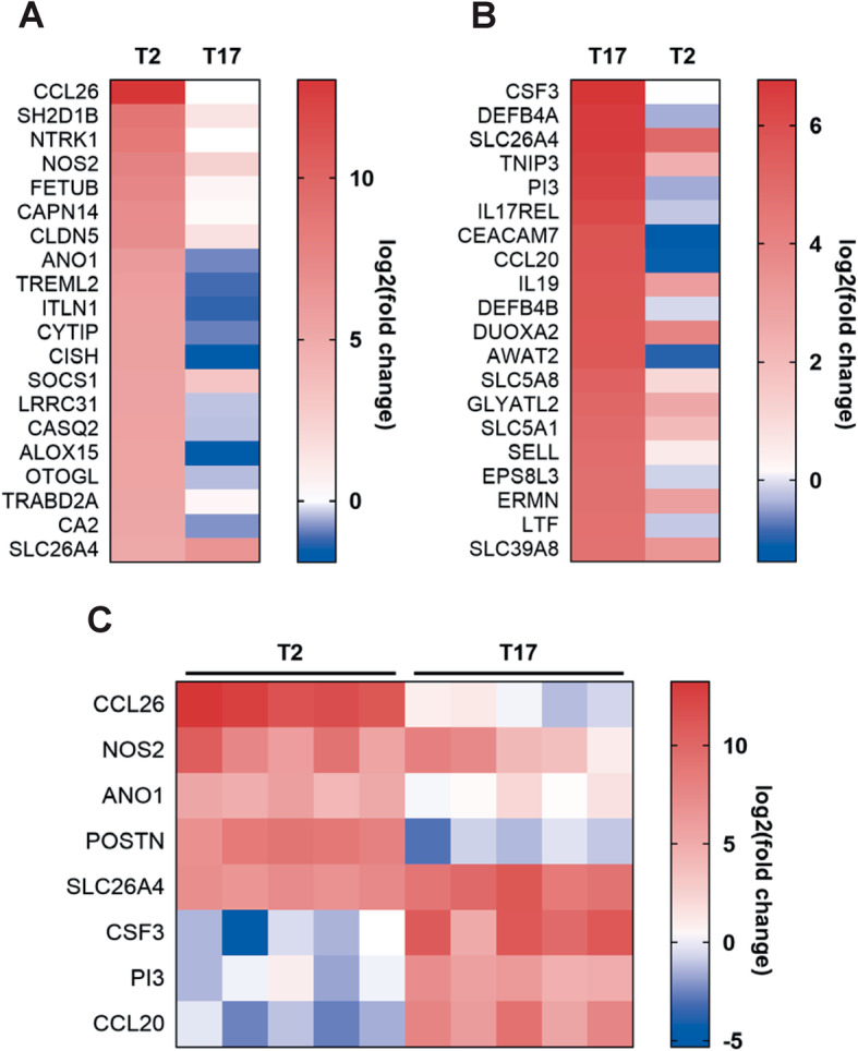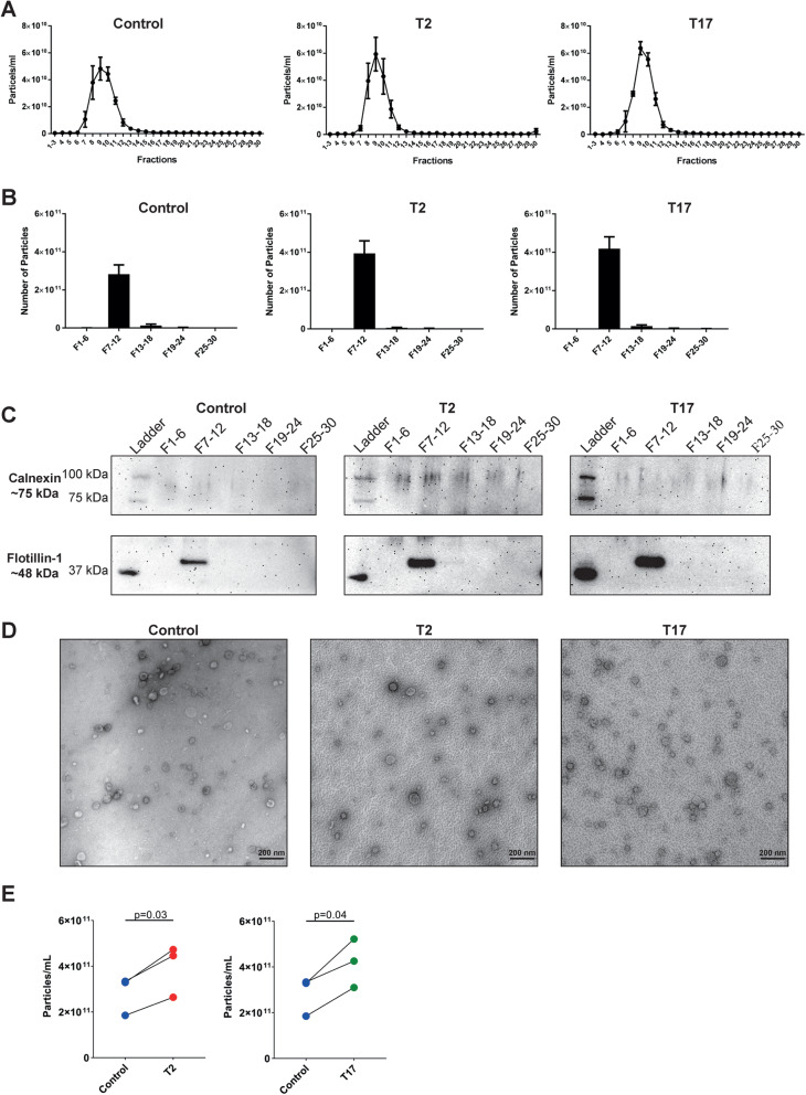 Methods: EVs from cytokine-stimulated (T2: IL-4 + IL-13 or T17: IL-17A + TNFα) human bronchial epithelial cells cultured at air-liquid interface (HBEC-ALI) were isolated by density cushion centrifugation and size exclusion chromatography and characterized with Western blotting and electron microscopy. Transcriptomic (cells) and proteomic (EVs) profiling was also performed.