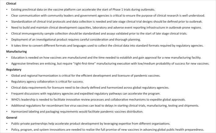 The world is experiencing an unprecedented global pandemic of coronavirus disease 2019 (COVID-19) caused by a novel coronavirus, Severe Acute Respiratory Syndrome-coronavirus-2 (SARS-CoV-2). Development of new vaccines and therapeutics are important to achieve long-term prevention and control of the virus. Experience gained in the development of vaccines for Ebola virus disease provide important lessons in the regulatory, clinical, and manufacturing process that can be applied to SARS-CoV-2 and other epidemic pathogens. This report outlines the main lessons learned by Merck Sharp & Dohme Corp., a subsidiary of Merck & Co., Inc., Kenilworth, NJ, USA (MSD) during development of an Ebola Zaire vaccine (ERVEBO®) and looks ahead to critical lessons beyond vaccine development. It highlights focus areas for public-private partnership and regulatory harmonization that can be directly applied to current vaccine development efforts for SARS-CoV-2, while drawing attention to the need for parallel consideration of issues beyond development that are equally important to achieve global preparedness and response goals.