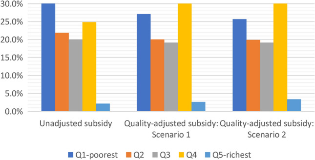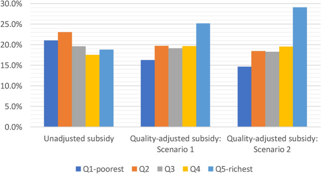 Equity in health care financing has gained increased attention in low- and middle-income countries (LMICs) following the renewed global interest in universal health coverage (UHC), a key component of the sustainable development goals (SDGs). UHC requires that people have access to the health services they need without risking financial hardship. Health financing is central to UHC and many LMICs have initiated reforms to align their health financing systems with the goals of UHC. Evaluation of the equity impact of these reforms has become a growing area of research, especially in countries with large health inequalities where the pressure to move towards UHC is most intense and the need for evidence to inform policy most critical. However, current analytical tools for evaluating equity in health financing conspicuously exclude indicators of quality, an important dimension of UHC. The aim of this paper was to address this critical methodological gap by introducing quality scores into benefit incidence analysis (BIA), one of the key techniques for assessing equity in health financing. BIA measures the extent to which different socioeconomic groups benefit from public spending on health care through their use of health services. The benefit (public subsidy) is captured in monetary terms by multiplying the quantity of a particular health service consumed by the unit cost of that service and subtracting any out-of-pocket costs incurred while using the service. It does not account for variations in the quality of health services in the computation of the public subsidy.