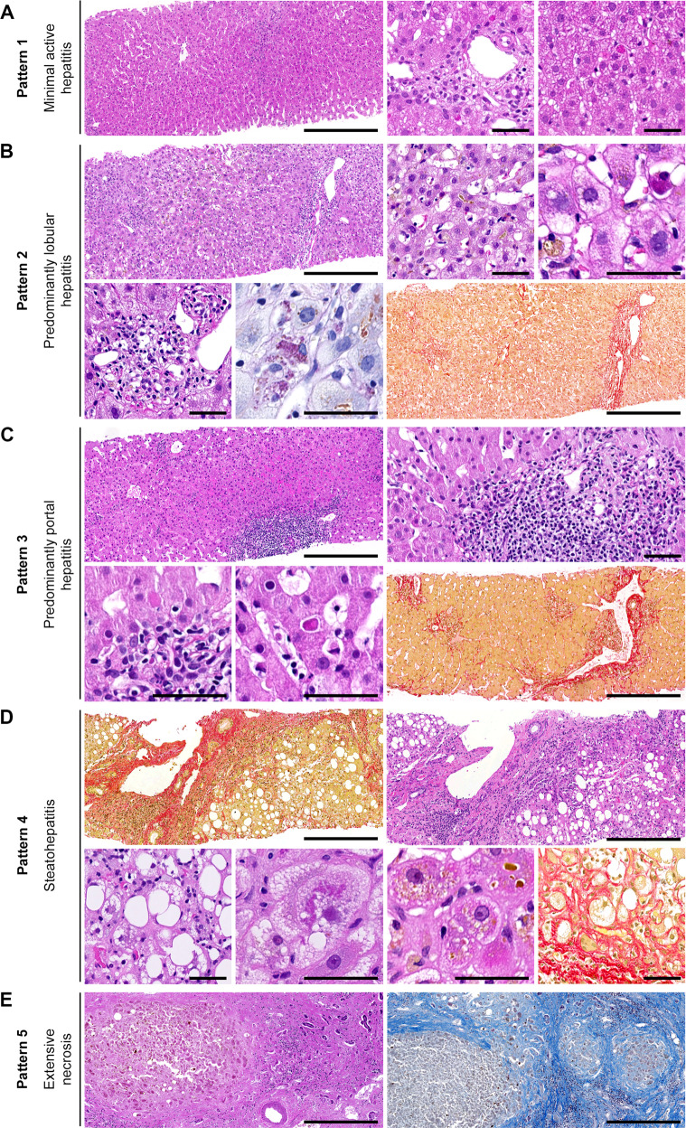Infection with the hepatitis E virus (HEV) is one of the main causes of acute hepatitis worldwide. Given that, the histopathology of hepatitis E is relatively poorly characterized, and it is unclear what exactly determines its remarkable variability. The aim of our study was a systematic analysis of hepatitis E histology, especially with regard to the clinical setting. Fifty-two liver samples (48 biopsies, 1 liver explant, 3 autopsy livers) from 41 patients with molecularly proven hepatitis E (28 HEV genotype (gt) 3, three gt 1, one gt 4 and 9 undetermined gt) were systematically evaluated for 33 histopathologic features. Following one approach, the biopsies were assigned to one of five generic histologic patterns. In another approach, they were subjected to hierarchical clustering. We found that 23/41 (56%) patients were immunocompromised, whereas 18 (44%) had no known immunosuppression. Five patients (12%) had pre-existing liver disease (LD). The histopathologic spectrum ranged from almost normal to acute, chronic, and steato-hepatitis to subtotal necrosis, and was thus distributed across all five generic patterns. Hierarchical clustering, however, identified three histopathologic clusters (C1-C3), which segregated along the immune status and pre-existing LD: C1 comprised mostly patients with pre-existing LD; histology mainly reflected the respective LD without pointing to the additional hepatitis E. C2 comprised mostly immunocompetent patients; histology mainly displayed florid hepatitis. C3 comprised mostly immunocompromised patients; histology mainly displayed smoldering hepatitis. Accordingly, C1-C3 differed markedly with respect to their clinical and histopathologic differential diagnoses. Hierarchical clustering suggests three groups with distinct histopathologies, indicating biologically different manifestations of hepatitis E. The association of histopathologic changes with the patient's immune status and pre-existing LD plausibly explains the diversity of hepatitis E histopathology, and suggests that these factors are the crucial underlying determinants. We expect our results to improve patient management by guiding the clinico-pathologic diagnosis of hepatitis E.