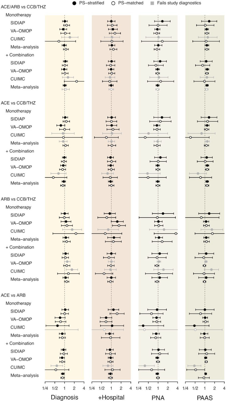 Methods: Using electronic health records from Spain (SIDIAP) and the United States (Columbia University Irving Medical Center and Department of Veterans Affairs), we conducted a systematic cohort study with prevalent ACE, ARB, calcium channel blocker (CCB) and thiazide diuretic (THZ) use to determine relative risk of COVID-19 diagnosis and related hospitalization outcomes. The study addressed confounding through large-scale propensity score adjustment and negative control experiments.