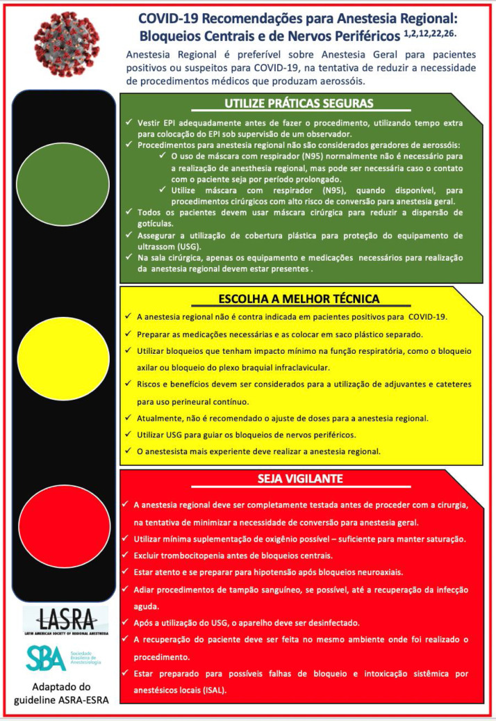 - COVID‐19 Guidance for Regional Anesthesia Neuraxial Anesthesia and Peripheral Nerve Blocks. Disponível em https://esraeurope.org/wp‐content/uploads/2020/04/ESRAASRA‐COVID‐19‐Guid.... Acesso em 21/04/2020.