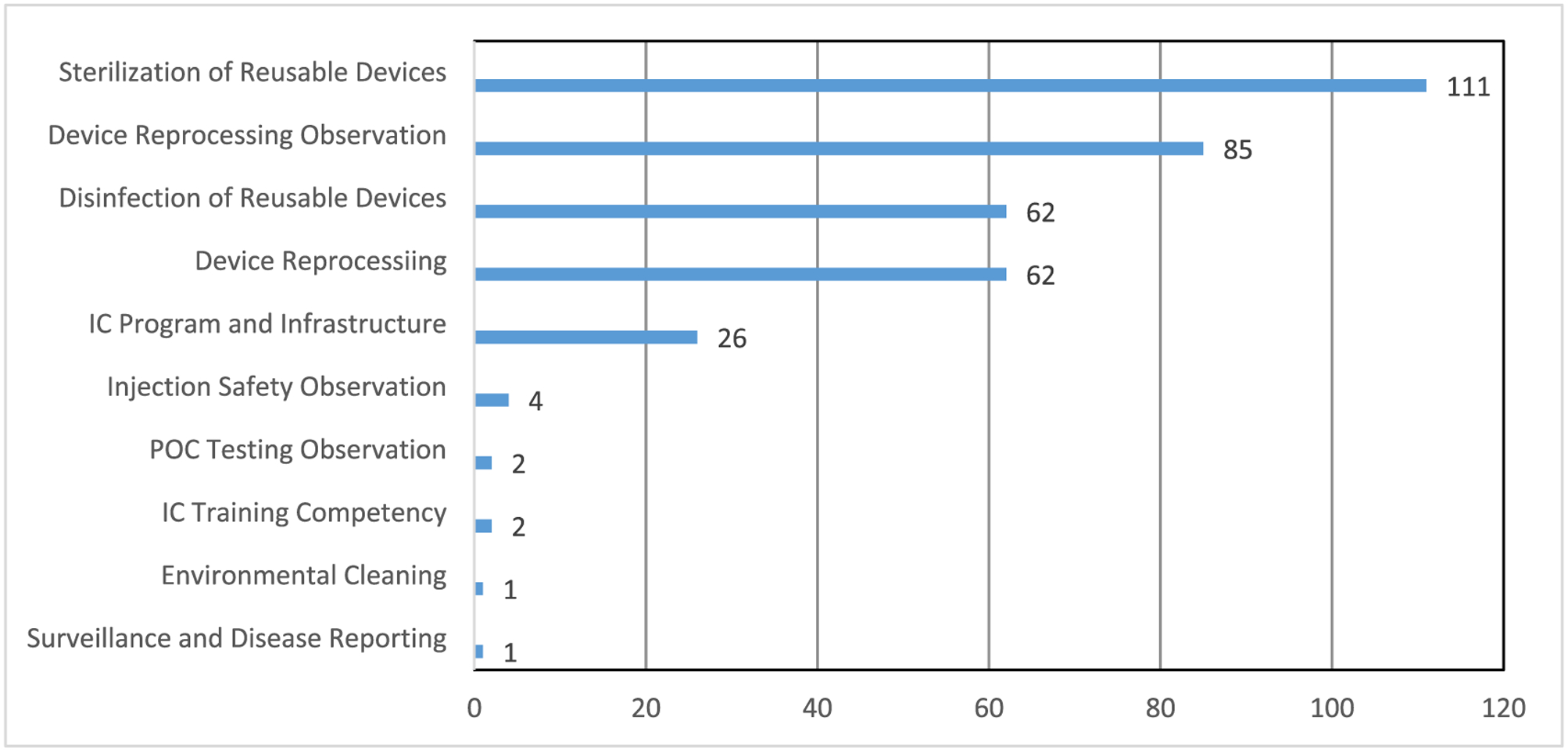 Results: Of 845 ambulatory organizations, 39 (4.6%) had breaches observed during the survey process and reported to health departments. Within these organizations, surveyors documented 356 breaches, representing 52 different breach codes. Common breach domains were sterilization of reusable devices, device reprocessing observation, device reprocessing, disinfection of reusable devices, and infection control program and infrastructure. Eight of the 39 facilities (20.5%) were cited for not performing the minimum level of reprocessing based on the items' intended use, reusing single-use devices, and/or not using aseptic technique to prepare injections.