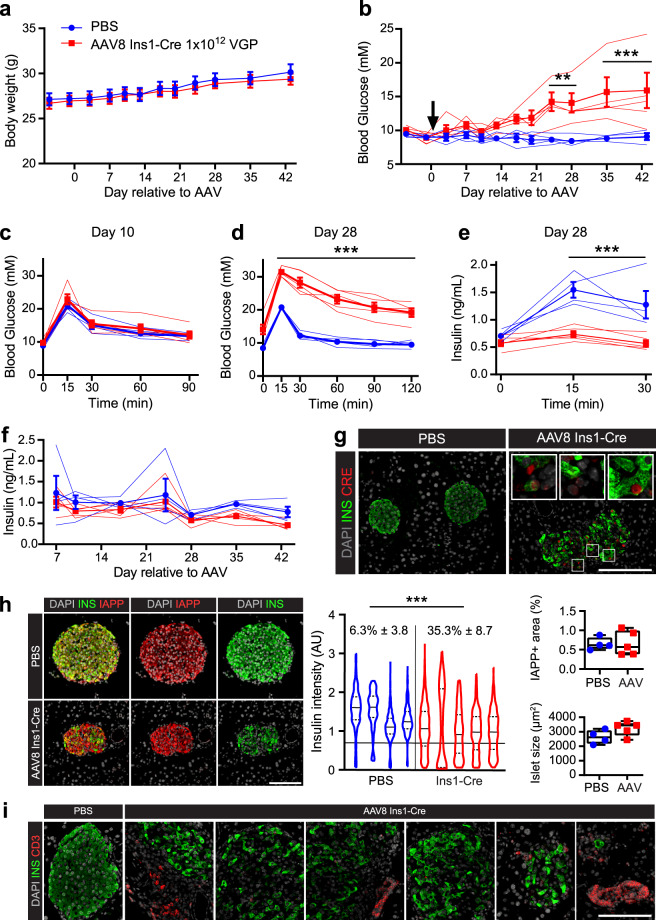 In vivo genetic manipulation is used to study the impact of gene deletion or re-expression on β-cell function and organism physiology. Cre-LoxP is a system wherein LoxP sites flanking a gene are recognized by Cre recombinase. Cre transgenic mice are the most prevalent technology used to deliver Cre but many models have caveats of off-target recombination, impaired β-cell function, and high cost of animal production. Inducible estrogen receptor conjugated Cre models face leaky recombination and confounding effects of tamoxifen. As an alternative, we characterize an adeno associated virus (AAV) with a rat insulin 1 promoter driving Cre recombinase (AAV8 Ins1-Cre) that is economical and rapid to implement, and has limited caveats. Intraperitoneal AAV8 Ins1-Cre produced efficient β-cell recombination, alongside some hepatic, exocrine pancreas, α-cell, δ-cell, and hypothalamic recombination. Delivery of lower doses via the pancreatic duct retained good rates of β-cell recombination and limited rates of off-target recombination. Unlike inducible Cre in transgenic mice, AAV8 Ins1-Cre required no tamoxifen and premature recombination was avoided. We demonstrate the utility of this technology by inducing hyperglycemia in inducible insulin knockout mice (Ins1-/-;Ins2f/f). AAV-mediated expression of Cre in β-cells provides an effective alternative to transgenic approaches for inducible knockout studies.