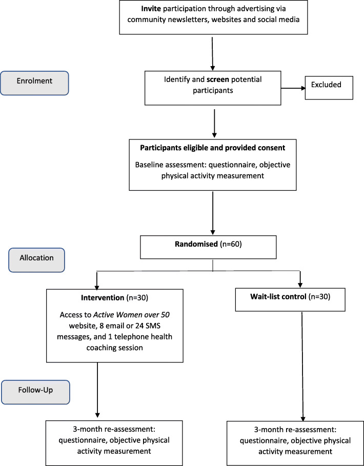Methods: Sixty community-dwelling women who are insufficiently active according to national guidelines, will be recruited and randomised to 1) receive the Active Women over 50 programme or 2) a wait-list control. Active Women over 50 is a 3-month physical activity programme guided by behaviour change science, providing access to a website, one telephone-delivered health coaching session from a physiotherapist and 8 email or 24 SMS messages. The primary outcome is the proportion of participants at 3 months post-randomisation who would recommend participation in the programme to another person like themselves. Secondary outcomes are feasibility measures: rates of recruitment, retention, completeness of outcome data and uptake of telephone support; and intervention impact measures: accelerometer-assessed average steps/day, proportion of participants meeting national guidelines on moderate to vigorous physical activity; and questionnaire-assessed quality of life, exercise perceptions, mood, physical functioning and self-reported physical activity. Intervention participants will also complete a follow-up survey to assess impressions of the intervention and adoption of strategies for physical activity participation. Data will be analysed descriptively to guide the design of a larger trial. Between-group differences in secondary outcomes will be used to estimate effect sizes for sample size calculations for a fully powered randomised controlled trial.