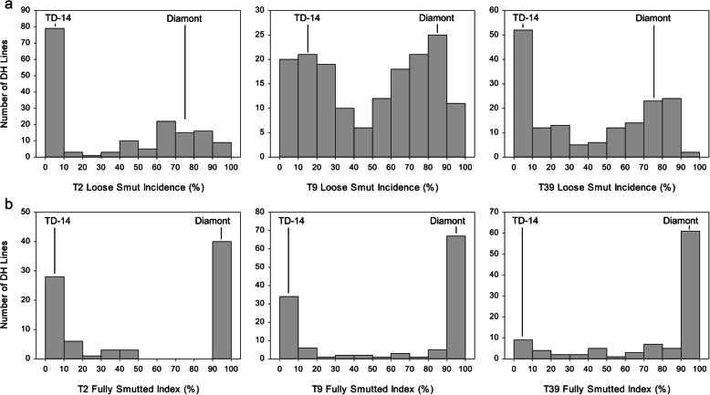 Background: The genetics of resistance to loose smut of wheat (Triticum aestivum L.) caused by the fungus Ustilago tritici (Pers.) Rostr. is not well understood. This study examines loose smut resistance in Sonop (TD-14), a South African spring wheat variety. A doubled haploid (DH) population of 163 lines derived from the cross Diamont/TD-14 was studied. The parents and progenies were inoculated with U. tritici races T2, T9, and T39 individually in growth facilities at Morden and Swift Current, Canada. Loose smut incidence (LSI) and partial loose smut resistance (PLSR) were assessed.
