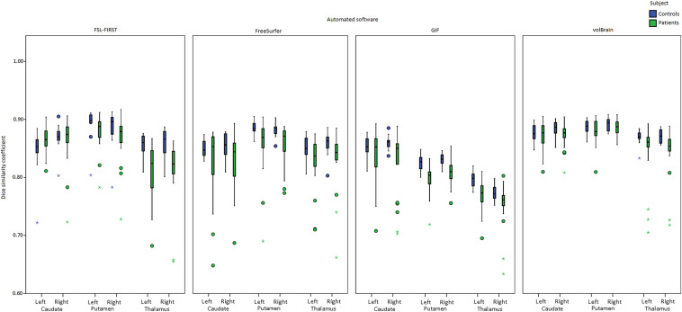 Results: ICC with manual volumes was mostly good and spatial agreement was high. MS exhibited significantly lower DSC than controls for thalamus and putamen. For some combinations of structure and method, DSC correlated negatively with lesion volume or positively with NBV or ROIV. Lesion-filling did not substantially change segmentations.