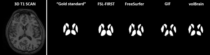 Methods: On images of 21 MS subjects and 11 controls, three raters manually outlined caudate nucleus, putamen and thalamus; outlines were combined by majority voting. FSL-FIRST, FreeSurfer, Geodesic Information Flow and volBrain were evaluated. Performance was evaluated volumetrically (intra-class correlation coefficient (ICC)) and spatially (Dice similarity coefficient (DSC)). Spearman's correlations of DSC with global and local lesion volume, structure of interest volume (ROIV), and normalized brain volume (NBV) were assessed.