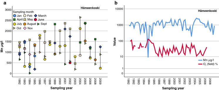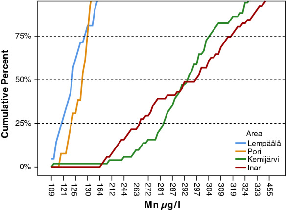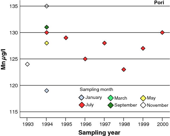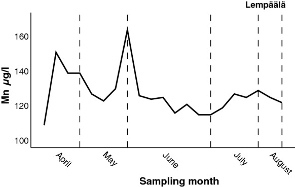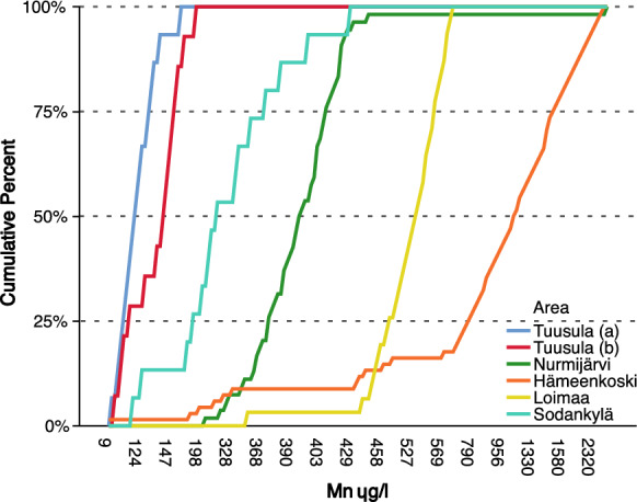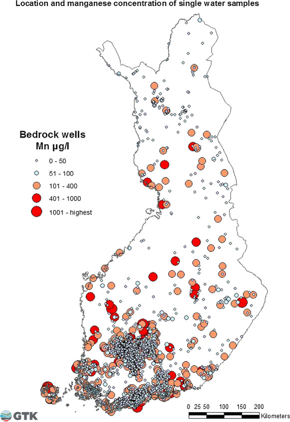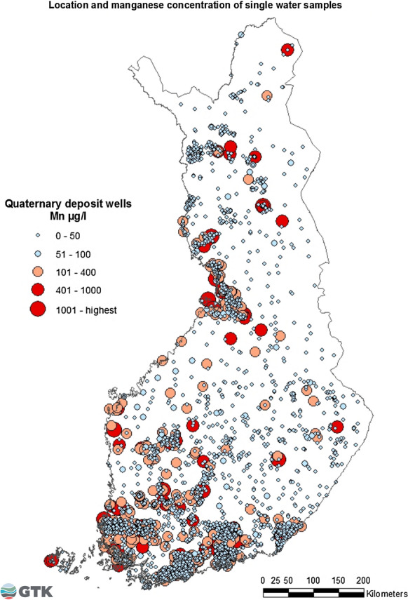 Increasing evidence has emerged that Mn derived from drinking water could be a health risk, especially for children. This study aimed to provide more information on the variation in Mn concentrations in well water and factors that affect manganese concentrations in groundwater in the natural environment. The geochemical data consisted of analyses of single water samples (n = 5311) that were taken only once and data from monitoring sites where water samples (n = 4607) were repeatedly taken and analyzed annually from the same wells. In addition, the well-specific results from six wells at monitoring sites were described in detail. We obtained the data on water samples from the groundwater database of Geological Survey of Finland. In single samples, Mn concentrations varied from < 0.02 µg/l to 5800 µg/l in bedrock well waters and up to 6560 µg/l in Quaternary deposit well waters. Results from single water samples from bedrock wells and Quaternary deposit wells indicated that the dissolved oxygen content has an inverse association with the Mn concentration. When the dissolved oxygen O2 levels were lower, the Mn concentrations were higher. No clear association was found between the Mn concentration and the pH or depth of the well for single samples. Part of Mn was particle bound, because total Mn was higher than soluble Mn in most measured samples. In the monitoring survey, large variation in Mn concentrations was found in bedrock well water in Kemijärvi, 114-352 µg/l, and in dug well water in Hämeenkoski, 8.77-2640 µg/l. Seasonal and spatial variability in Mn concentrations in water samples from two bedrock wells was large at monitoring sites in northern Finland. Variability in the Mn concentrations in groundwater can be large, even in the same area. These data suggest that single measurements of the Mn concentration from a water source may not reveal the Mn status, and measurement of both the total and soluble Mn concentrations may be recommended.