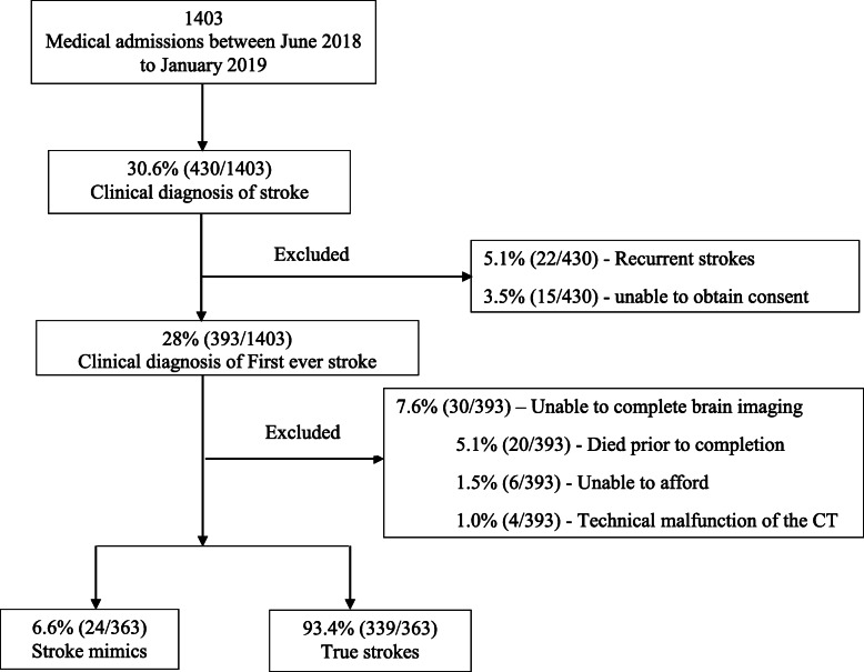 Results: Among 363 patients with suspected stroke on admission, the final diagnosis was stroke mimics in 24 (6.6%) who had a mean age of 65.8 ± 15 years. Patients with stroke mimics were less likely to have cardiovascular risk factors for stroke including premorbid hypertension (7 (29.2%) vs 263 (77.6%), p < 0.001) and increased waist-hip ratio (9 (37.5%) vs 270 (79.6%) p < 0.001) for mimics and true strokes respectively. Clinical findings such as hypertension and the presence of cortical features in neurological examination occurred less in patients with stroke mimics. The simplified FABS score of ≥3 could identify patients with stroke mimics with a sensitivity and specificity of 38 and 80% respectively. The most common causes of mimics were brain tumors 6 (25%), meningoencephalitis 4 (16.7%) and epileptic seizures 3 (12.5%). The majority of patients with stroke mimics had severe disease on admission and the 30-day mortality in these patients was 54.5%.