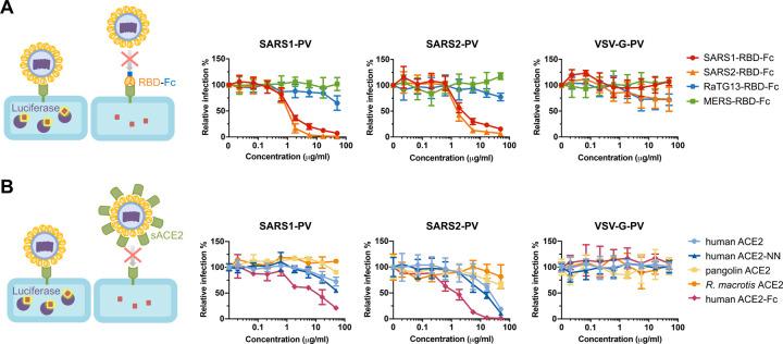The severe acute respiratory syndrome coronavirus 2 (SARS-CoV-2) spike (S) protein mediates infection of cells expressing angiotensin-converting enzyme 2 (ACE2). ACE2 is also the viral receptor of SARS-CoV (SARS-CoV-1), a related coronavirus that emerged in 2002-2003. Horseshoe bats (genus Rhinolophus ) are presumed to be the original reservoir of both viruses, and a SARS-like coronavirus, RaTG13, closely related SARS-CoV-2, has been isolated from one horseshoe-bat species. Here we characterize the ability of S-protein receptor-binding domains (RBDs) of SARS-CoV-1, SARS-CoV-2, and RaTG13 to bind a range of ACE2 orthologs. We observed that the SARS-CoV-2 RBD bound human, pangolin, and horseshoe bat ( R. macrotis) ACE2 more efficiently than the SARS-CoV-1 or RaTG13 RBD. Only the RaTG13 RBD bound rodent ACE2 orthologs efficiently. Five mutations drawn from ACE2 orthologs of nine Rhinolophus species enhanced human ACE2 binding to the SARS-CoV-2 RBD and neutralization of SARS-CoV-2 by an immunoadhesin form of human ACE2 (ACE2-Fc). Two of these mutations impaired neutralization of SARS-CoV-1. An ACE2-Fc variant bearing all five mutations neutralized SARS-CoV-2 five-fold more efficiently than human ACE2-Fc. These data narrow the potential SARS-CoV-2 reservoir, suggest that SARS-CoV-1 and -2 originate from distinct bat species, and identify a more potently neutralizing form of ACE2-Fc.
