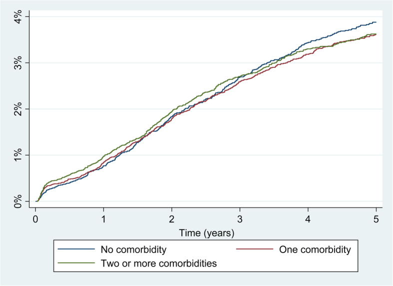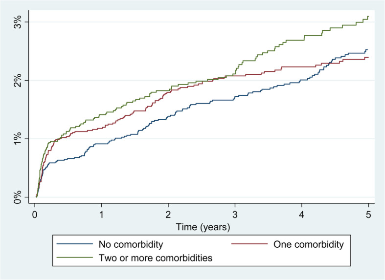 Methods: Patients recorded in the Catalan Arthroplasty Register (RACat) between 01/01/2005 and 31/12/2016 undergoing TKA (n = 49,701) and THA (n = 17,923) caused by osteoarthritis were included. As main explanatory factors, comorbidity burden was assessed by the Elixhauser index, categorized, and specific comorbidities from the index were taken into account. Descriptive analyses for comorbidity burden and specific conditions were done. Additionally, incidence at 1 and 5 years' follow-up was calculated, and adjusted Competing Risks models were fitted.