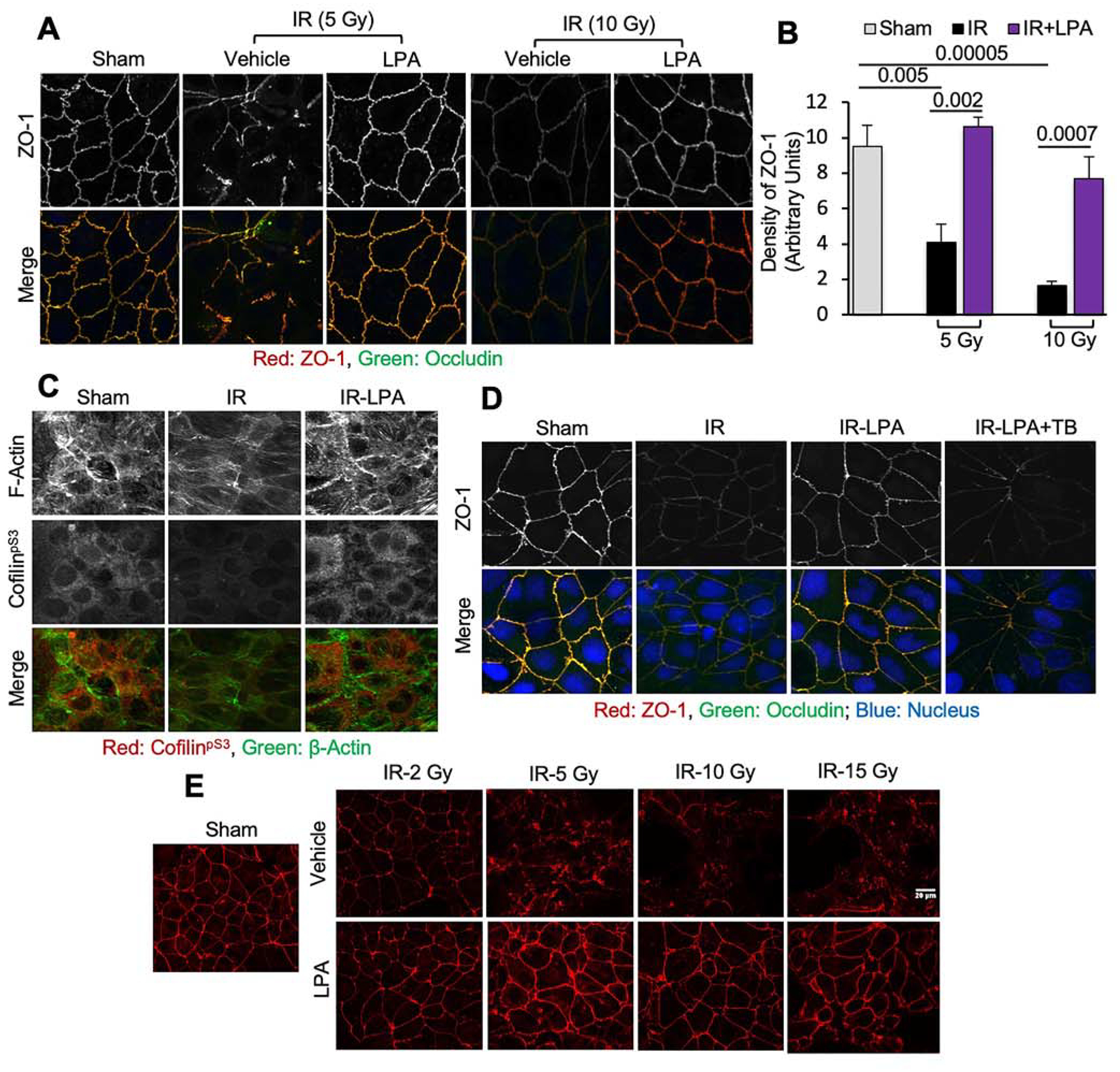 The tight junction (TJ) and barrier function of colonic epithelium is highly sensitive to ionizing radiation. We evaluated the effect of lysophosphatidic acid (LPA) and its analog, Radioprotein-1, on γ-radiation-induced colonic epithelial barrier dysfunction using Caco-2 and m-ICC12 cell monolayers in vitro and mice in vivo. Mice were subjected to either total body irradiation (TBI) or partial body irradiation (PBI-BM5). Intestinal barrier function was assessed by analyzing immunofluorescence localization of TJ proteins, mucosal inulin permeability, and plasma lipopolysaccharide (LPS) levels. Oxidative stress was analyzed by measuring protein thiol oxidation and antioxidant mRNA. In Caco-2 and m-ICC12 cell monolayers, LPA attenuated radiation-induced redistribution of TJ proteins, which was blocked by a Rho-kinase inhibitor. In mice, TBI and PBI-BM5 disrupted colonic epithelial tight junction and adherens junction, increased mucosal permeability, and elevated plasma LPS; TJ disruption by TBI was more severe in Lpar2-/- mice compared to wild-type mice. RP1, administered before or after irradiation, alleviated TBI and PBI-BM5-induced TJ disruption, barrier dysfunction, and endotoxemia accompanied by protein thiol oxidation and downregulation of antioxidant gene expression, cofilin activation, and remodeling of the actin cytoskeleton. These data demonstrate that LPAR2 receptor activation prevents and mitigates γ-irradiation-induced colonic mucosal barrier dysfunction and endotoxemia.