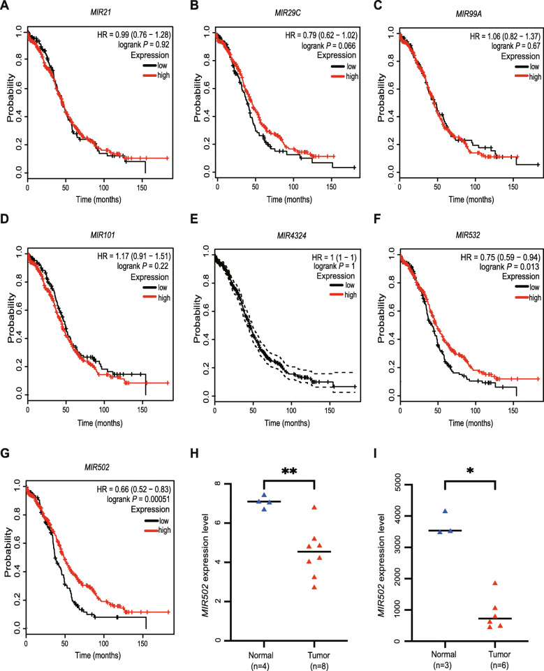 Methods: We integrated two microRNA expression arrays from GEO to identify differentially expressed genes. The Kaplan-Meier method was used to screen for miRNAs that had an influence on survival outcome. Upstream regulators of MIR502 were predicted by JASPAR and verified by ChIP-seq data. The LinkedOmics database was used to study genes that were correlated with MIR502. Gene Set Enrichment Analysis (GSEA) was conducted for functional annotation with GO and KEGG pathway enrichment analyses by using the open access WebGestalt tool. We constructed a PPI network by using STRING to further explore the core proteins.