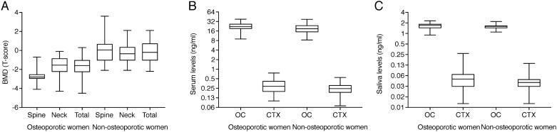 Saliva was proposed as a diagnostic tool for systemic diseases. Here we determined the correlation of bone turnover markers in saliva, bone turnover markers in serum and bone mineral density in postmenopausal osteoporotic and healthy women. Forty postmenopausal osteoporotic and 40 age-matched healthy non-osteoporotic females were recruited for this case-control study. Serum and stimulated saliva levels of osteocalcin, N-terminal propeptide of type I collagen, bone-specific alkaline phosphatase and cross-linked-C-telopeptide of type I collagen were determined. Bone mineral density of the lumbar spine, proximal femur, and total hip were obtained. We show that osteocalcin and cross-linked-C-telopeptide of type I collagen (CTX) reached detectable levels in saliva while N-terminal propeptide of type I collagen and alkaline phosphatase were close or below the detection limit. Serum levels of bone turnover markers were significantly higher than saliva levels. Correlation analysis revealed a strong correlation of serum osteocalcin and, to a lesser extent, also serum CTX values with bone mineral density in lumbar spine, femoral neck, or total hip, respectively. There was, however, no significant correlation of bone mineral density with the respective bone turnover markers in saliva. There was a trend that saliva osteocalcin correlates with femoral neck (p = 0.16) or total hip (p = 0.06). There was also no association between serum and saliva bone turnover markers. This study reveals that saliva cannot replace the withdrawal of serum to evaluate bone metabolism.