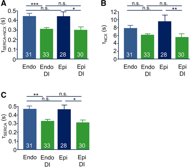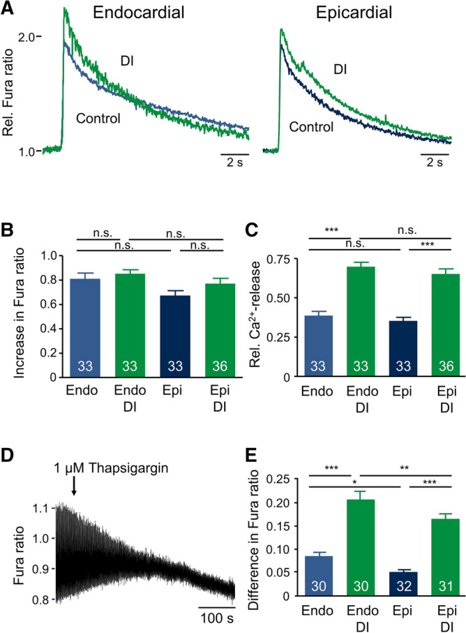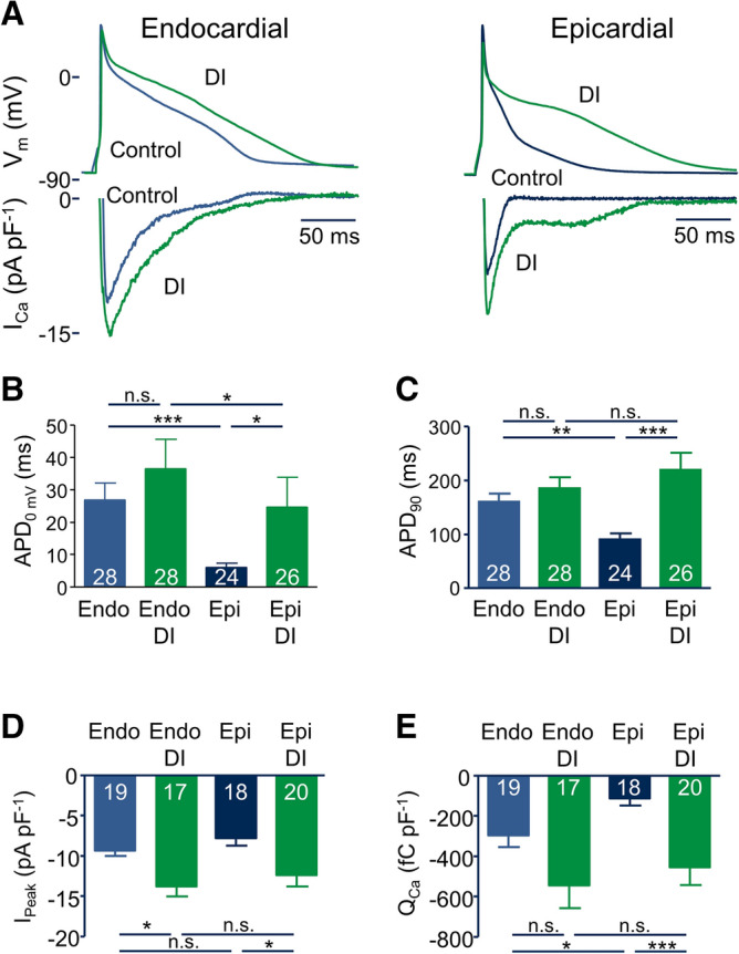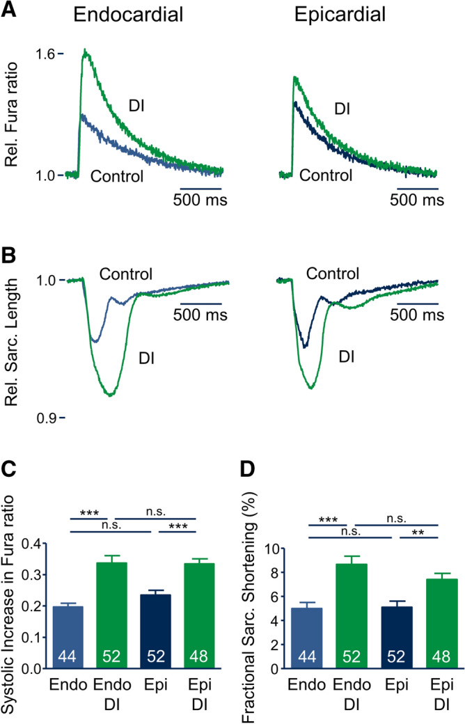 Regional differences in ion channel activity in the heart control the sequence of repolarization and may contribute to differences in contraction. Corticosteroids such as aldosterone or corticosterone increase the L-type Ca2+ current (ICaL) in the heart via the mineralocorticoid receptor (MR). Here, we investigate the differential impact of corticosteroid-mediated increase in ICaL on action potentials (AP), ion currents, intracellular Ca2+ handling and contractility in endo- and epicardial myocytes of the rat left ventricle. Dexamethasone led to a similar increase in ICaL in endocardial and epicardial myocytes, while the K+ currents Ito and IK were unaffected. However, AP duration (APD) and AP-induced Ca2+ influx (QCa) significantly increased exclusively in epicardial myocytes, thus abrogating the normal differences between the groups. Dexamethasone increased Ca2+ transients, contractility and SERCA activity in both regions, the latter possibly due to a decrease in total phospholamban (PLB) and an increase PLBpThr17. These results suggest that corticosteroids are powerful modulators of ICaL, Ca2+ transients and contractility in both endo- and epicardial myocytes, while APD and QCa are increased in epicardial myocytes only. This indicates that increased ICaL and SERCA activity rather than QCa are the primary drivers of contractility by adrenocorticoids.