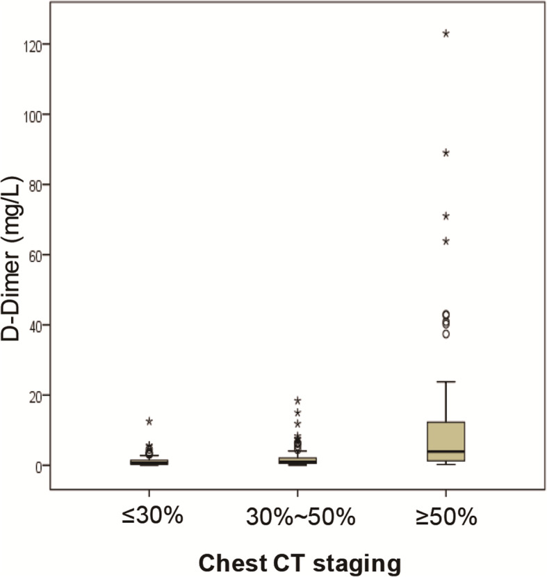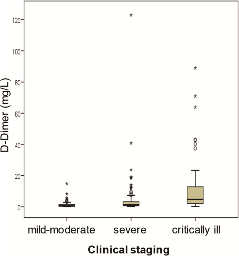 Results: Multivariable regression that showed D-dimer > 2.0 mg/L at admission was the only variable associated with increased odds of mortality [OR 10.17 (95% CI 1.10-94.38), P = 0.041]. D-dimer elevation (≥ 0.50 mg/L) was seen in 74.6% (185/248) of the patients. Pulmonary embolism and deep vein thrombosis were ruled out in patients with high probability of thrombosis. D-dimer levels significantly increased with increasing severity of COVID-19 as determined by clinical staging (Kendall's tau-b = 0.374, P = 0.000) and chest CT staging (Kendall's tau-b = 0.378, P = 0.000). In-hospital mortality rate was 6.9%. Median D-dimer level in non-survivors (n = 17) was significantly higher than in survivors (n = 231) [6.21 (3.79-16.01) mg/L versus 1.02 (0.47-2.66) mg/L, P = 0.000]. D-dimer level of > 2.14 mg/L predicted in-hospital mortality with a sensitivity of 88.2% and specificity of 71.3% (AUC 0.85; 95% CI = 0.77-0.92).