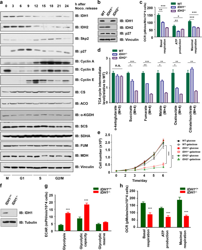 Whether glucose is predominantly metabolized via oxidative phosphorylation or glycolysis differs between quiescent versus proliferating cells, including tumor cells. However, how glucose metabolism is coordinated with cell cycle in mammalian cells remains elusive. Here, we report that mammalian cells predominantly utilize the tricarboxylic acid (TCA) cycle in G1 phase, but prefer glycolysis in S phase. Mechanistically, coupling cell cycle with metabolism is largely achieved by timely destruction of IDH1/2, key TCA cycle enzymes, in a Skp2-dependent manner. As such, depleting SKP2 abolishes cell cycle-dependent fluctuation of IDH1 protein abundance, leading to reduced glycolysis in S phase. Furthermore, elevated Skp2 abundance in prostate cancer cells destabilizes IDH1 to favor glycolysis and subsequent tumorigenesis. Therefore, our study reveals a mechanistic link between two cancer hallmarks, aberrant cell cycle and addiction to glycolysis, and provides the underlying mechanism for the coupling of metabolic fluctuation with periodic cell cycle in mammalian cells.