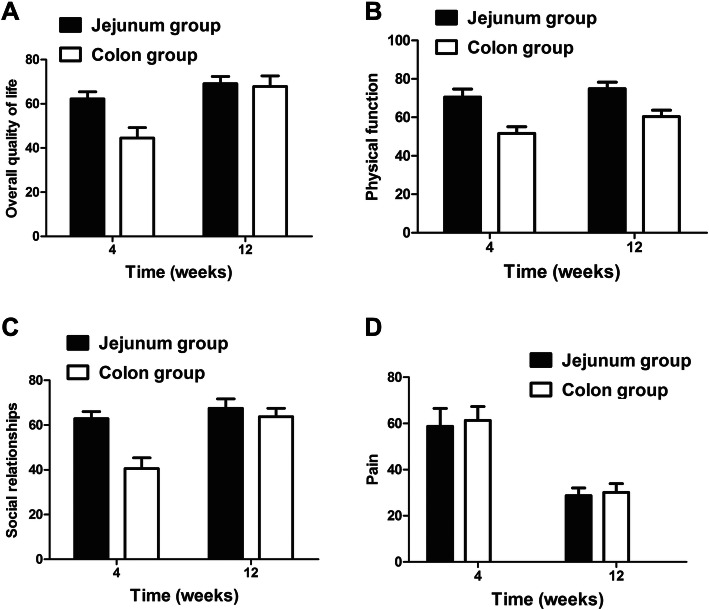 Results: Compared with the colon group, the jejunum group had a lower incidence of postoperative anastomotic leakage, lesser duration of postoperative drainage, and faster recovery. Furthermore, the scores were better in the jejunum group than in the colon group, in terms of short-term overall quality of life, physical function and social relationships. Moreover, the jejunal group had a significantly lower frequency of pH < 4 simultaneous reflux time > 5 min (N45) and the longest reflux time (LT) at 24 weeks after surgery.