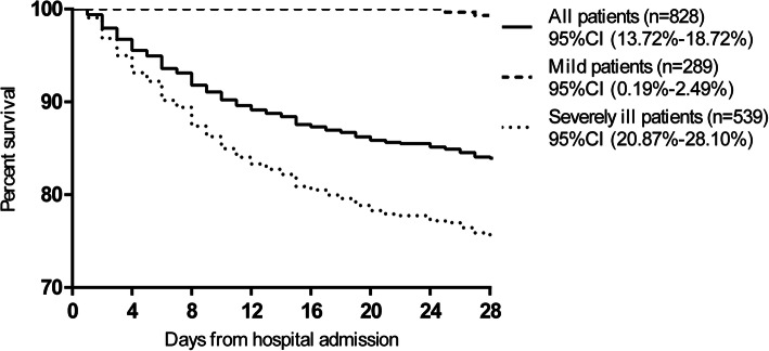 Methods: In this multicenter, retrospective, cohort study, we examined 828 hospitalized patients with confirmed COVID-19 hospitalized in Wuhan Union Hospital and Central Hospital of Wuhan between January 12 and February 9, 2020. Among the 828 patients, 516 and 186 consecutive patients admitted in Wuhan Union Hospital were enrolled in the training cohort and the validation cohort, respectively. A total of 126 patients hospitalized in Central Hospital of Wuhan were enrolled in a second external validation cohort. Demographic, clinical, radiographic, and laboratory measures; treatment; proximate causes of death; and 14-day and 28-day mortality are described. Patients' data were collected by reviewing the medical records, and their 14-day and 28-day outcomes were followed up.