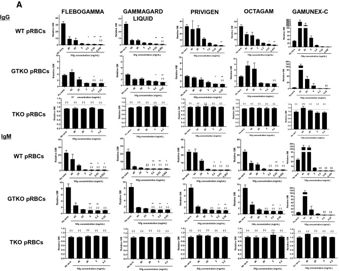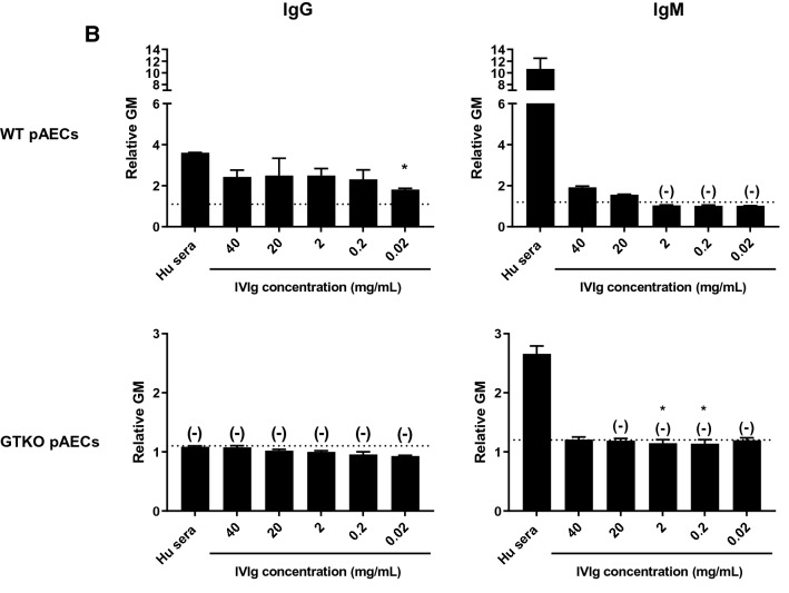 Triple-knockout (TKO) pigs may be ideal sources of organs for clinical xenotransplantation because many humans have no preformed antibody to TKO pig cells. Intravenous immunoglobulin (IVIg) is widely used for severe infection or the treatment/prevention of antibody-mediated rejection in allotransplantation. Anti-pig antibodies in IVIg could be harmful in clinical xenotransplantation. It is unknown whether anti-TKO pig antibodies are present in IVIg. The main aim of this study was to investigate in vitro whether IVIg contains anti-TKO pig antibodies with cytotoxic effect to pig cells. Undiluted pooled human serum (HS) and five different commercial preparations of IVIg were tested for IgM and IgG binding to red blood cells (RBCs) from wild-type (WT), α1,3-galactosyltransferase gene-knockout (GTKO), and TKO pigs by flow cytometry. Complement-dependent lysis of IVIg against these pig pRBCs was measured by hemolytic assay. Pooled HS and 4 of 5 IVIg commercial preparations contained anti-pig IgG that bound to WT and GTKO pRBCs, but not to TKO pRBCs. One preparation of IVIg contained antibodies that bound to TKO pRBCs, but there was no cytotoxicity of IVIg to TKO pRBCs. The results suggest that IVIg administration to human recipients of TKO pig grafts would be safe. However, the specific preparation of IVIg would need to be screened before its administration.