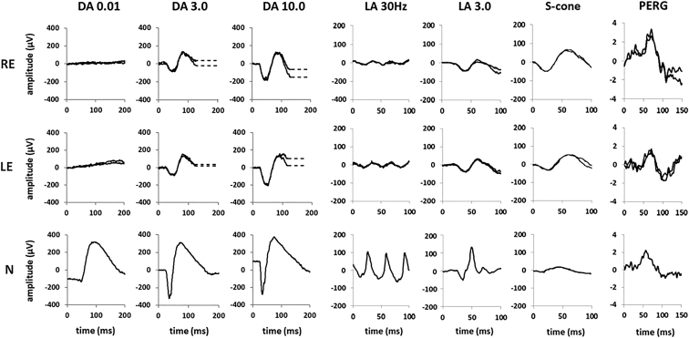 Main outcome measures: Age at onset of visual symptoms, best-corrected visual acuity (BCVA), quantitative age-related electrophysiologic decline, and imaging findings.