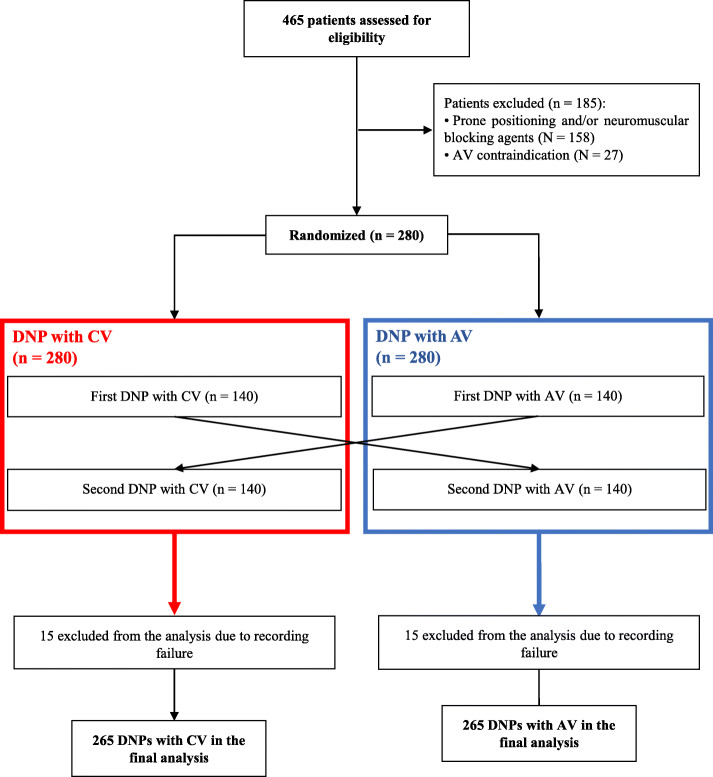 Results: Of the 265 included patients, 93% had been admitted for a medical pathology, the majority for acute respiratory failure (52%). There was no difference between the two periods in terms of DNP duration, sedation requirements, or ventilation parameters, but patients had more spontaneous breaths and lower peak airway pressures during the AV period (p < 0.001). The percentage of time spent with SpO2 in the acceptable range during DNPs was longer in the AV period than in the CV period (48 ± 37 vs. 43 ± 37, percentage of DNP period; p = 0.03). After adjustment, AV was associated with a higher number of DNPs carried out with SpO2 in the acceptable range (odds ratio, 1.82; 95% CI, 1.28 to 2.6; p = 0.001) and a lower incidence of blood oxygen desaturation ≤ 85% (adjusted odds ratio, 0.50; 95% CI, 0.30 to 0.85; p = 0.01).